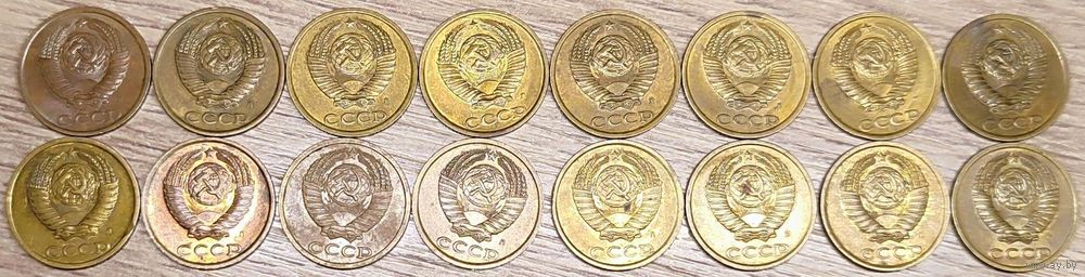 Описание аверса: Штемпель 1.12. герб приподнят к выступающему канту монеты, герб СССР - 15 витков ленты. Штемпель 1.12. звезда выпуклая со сглаженными гранями, гребенка остей справа с уступом, герб СССР - 15 витков ленты. Штемпель 1.13. звезда с четкими гранями, гребенка остей справа с уступом, герб СССР - 15 витков ленты. Штемпель 1.2. звезда с четкими гранями, гребенка справа без уступа, герб СССР - 15 витков ленты