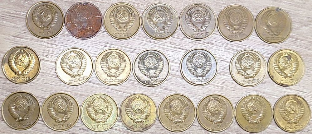 Описание реверса: Штемпель Ф-117. Штемпель А, цифра номинала, венок и колосья отдалены от выступающего канта. Штемпель Б, цифра номинала, венок и колосья приближены к выступающему канту. Штемпель Ф-121,Ф-122,Ф-123. Штемпель А, зерна колосьев округлые, выпуклые. Штемпель Б, зерна колосьев ромбовидные, уплощенные. Штемпель Ф-126. Штемпель А, цифры даты тонкие (ЛМД). Штемпель Б, цифры даты толстые (ММД)