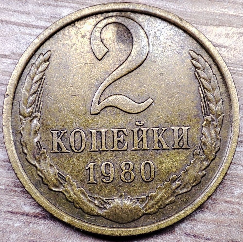 Двухкопеечные монеты, для денежного обращения СССР, чеканились на Ленинградском монетном дворе (ныне СПМД в городе Санкт – Петербург). Тиражная, рядовая монета, один из девяти номиналов, выпущенных с монетного двора в восьмидесятом году. Тип 1961 – 1991гг. Чеканилась как для обращения и, улучшенного качества, для годовых наборов Госбанка СССР. В них входили: 9 номиналов, выпущенных в этом году, плюс ромбовидный жетон монетного двора (ЛМД). Эти наборы производились специально для коллекционеров монет Советского Союза. В 1980 году выпускались как "жесткие" наборы (красного и чёрного цвета, конверт – желтого), так и "мягкие". Материал изготовления 2 копеек 1980г.: немагнитный медно–цинковый сплав (латунь). Соотношение сторон монеты (соосность) – медальное. Разновидностей нет