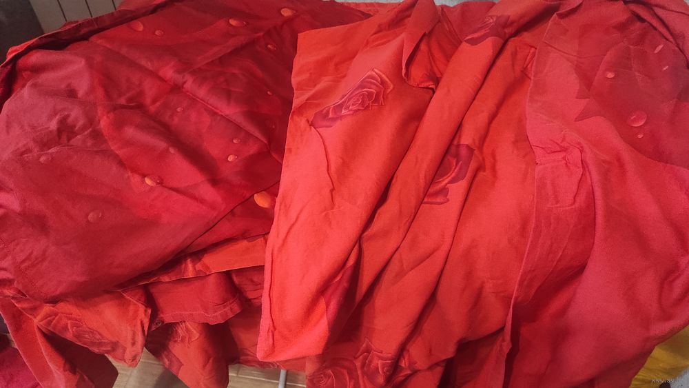 Фото 1-4. Красный цвет в розы. Пододеяльник 2 штуки (размер 215 см на 150 см). Наволочки 2 штуки (размер 68 на 47 см). Наволочки 2 штуки (общий размер 57 на 77 см, "рабочий" размер 67 на 45 см). Простыни нет. По составу не скажу, хлопок или сатин. Хороший, дорогой комплект, б/у, целый. Цена за 6 ед. Цена 50,00
