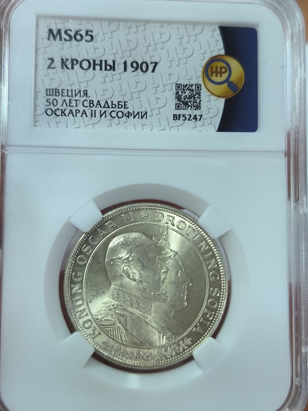 2 кроны 1907 Швеция ms 65 ННР - 50 лет свадьбе Оскара II и Софии