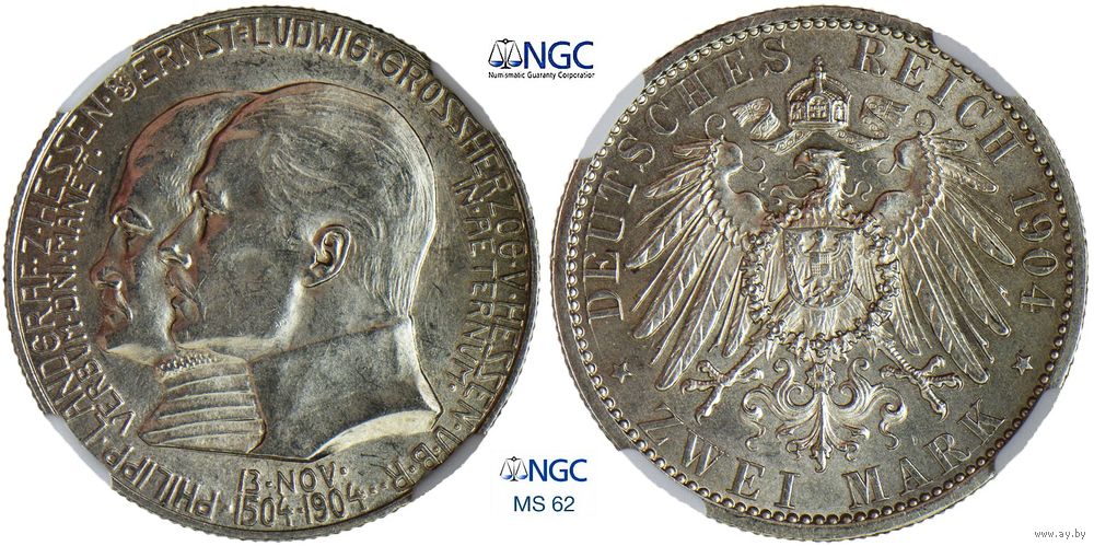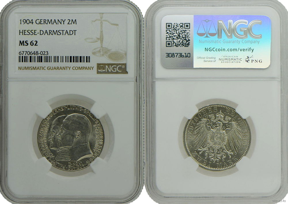 2 марки 1904 г. Гессен. Германия. NGC MS 62. 400 лет со дня рождения Филиппа Великодушного. Серебро. Редкая монета в отличном коллекционном состоянии. Монета в слабе NGC, сохранность MS 62. Краузе #372.