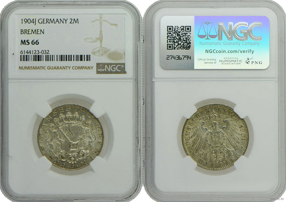 2 марки 1904 г. J. Бремен. Германия. NGC MS 64. Серебро. Редкая монета в превосходном коллекционном состоянии. Монета в слабе NGC, сохранность MS 66. Краузе #250.