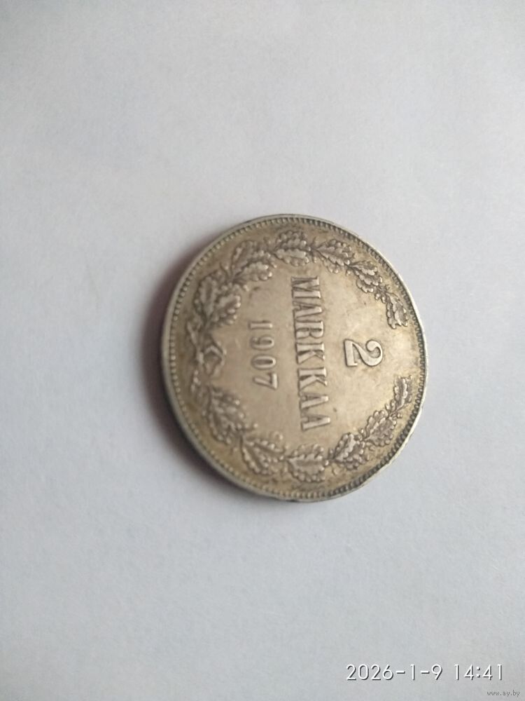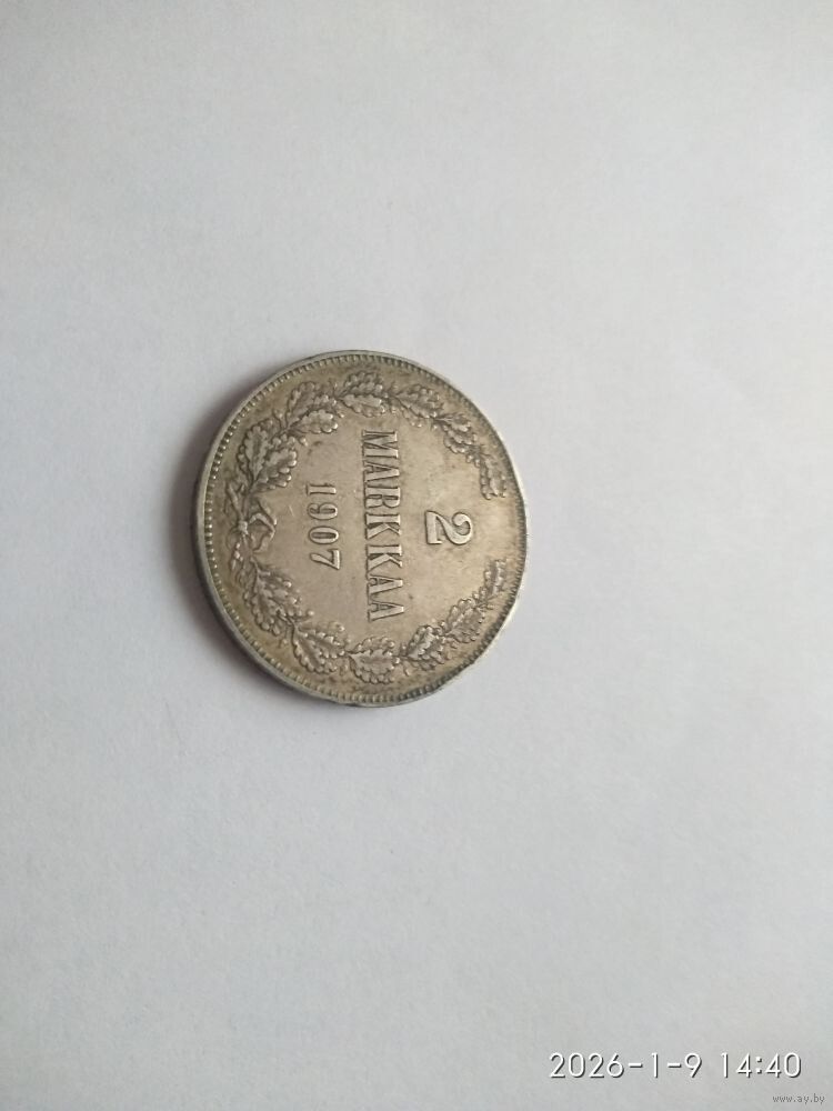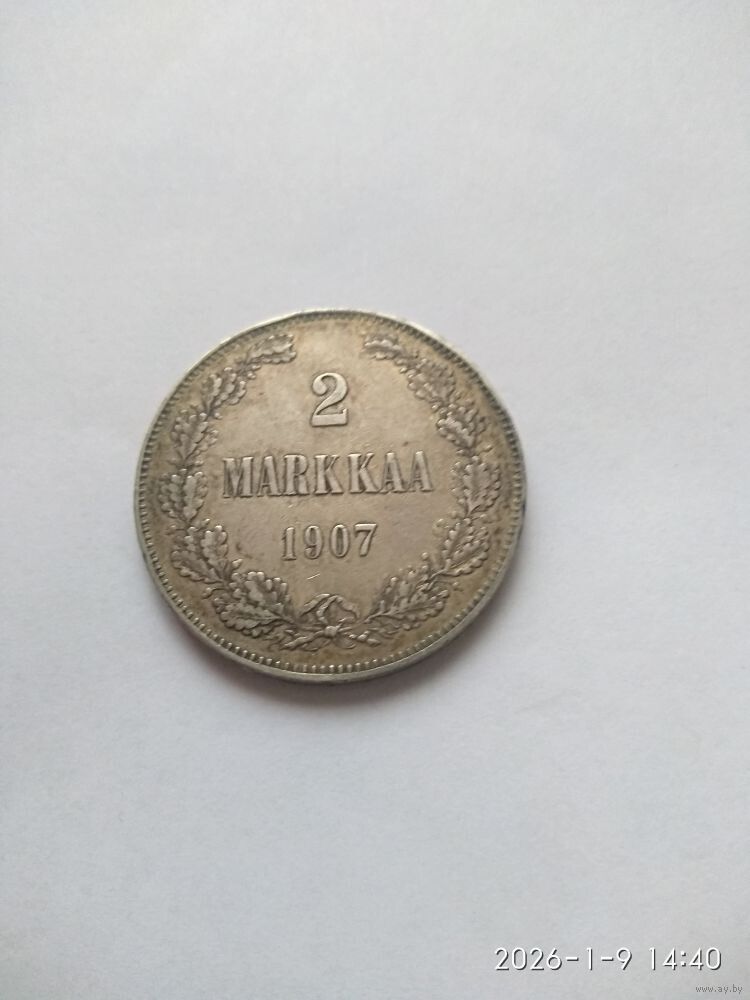 Реверс: слева и справа вдоль края монеты скрещенные и перевязанные внизу двойной лентой дубовые ветви, в середине вверху обозначение достоинства монеты «2», ниже слово «MARKKAA», под ним год выпуска монеты «1907».