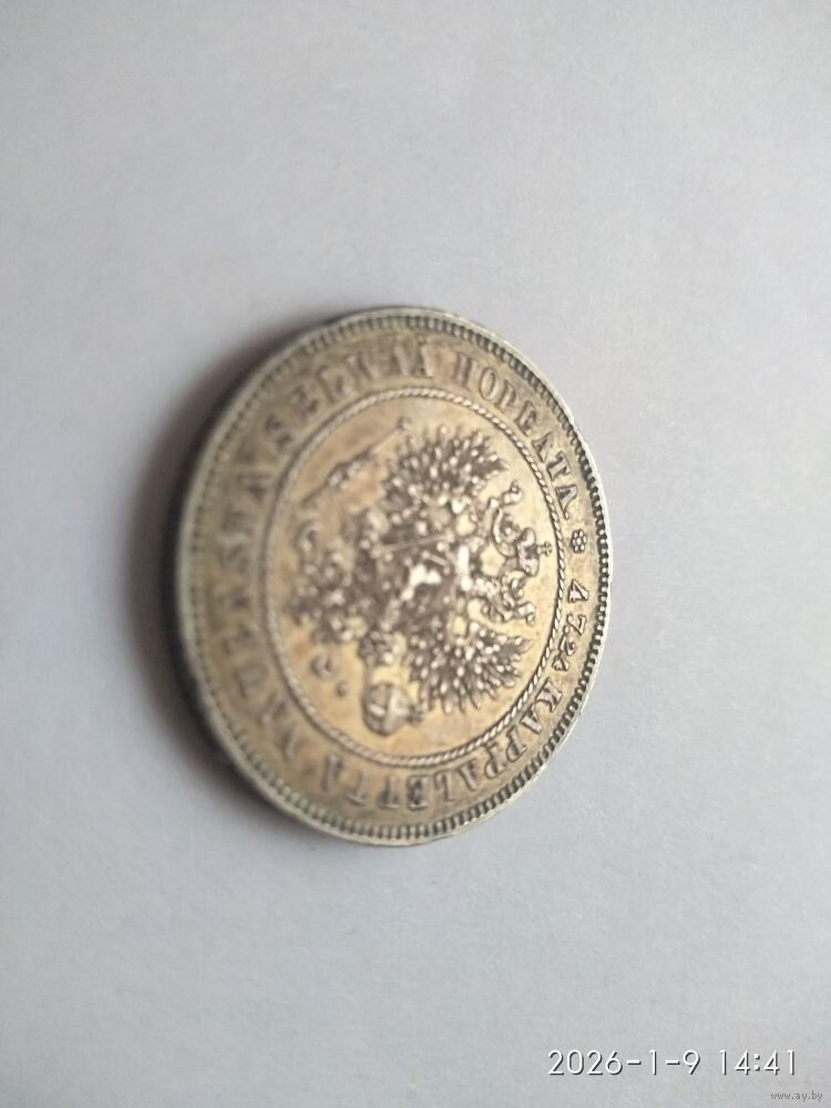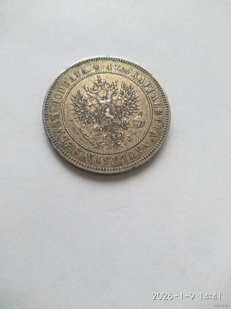 Аверс: вверху монеты розетка из семи точек, вдоль края монеты надпись (по часовой стрелке начиная от розетки) «47,24 KAPPALETTA NAULASTA SELWAA HOPEATA» - 47,24 штуки из фунта сплава серебра, в середине в витом ободке орел с Малого Государственного Герба Российской империи, на груди орла окруженный цепью Ордена Св. Андрея Первозванного герб Великого Княжества Финляндского, справа от хвоста орла инициал минцмейстера «L».