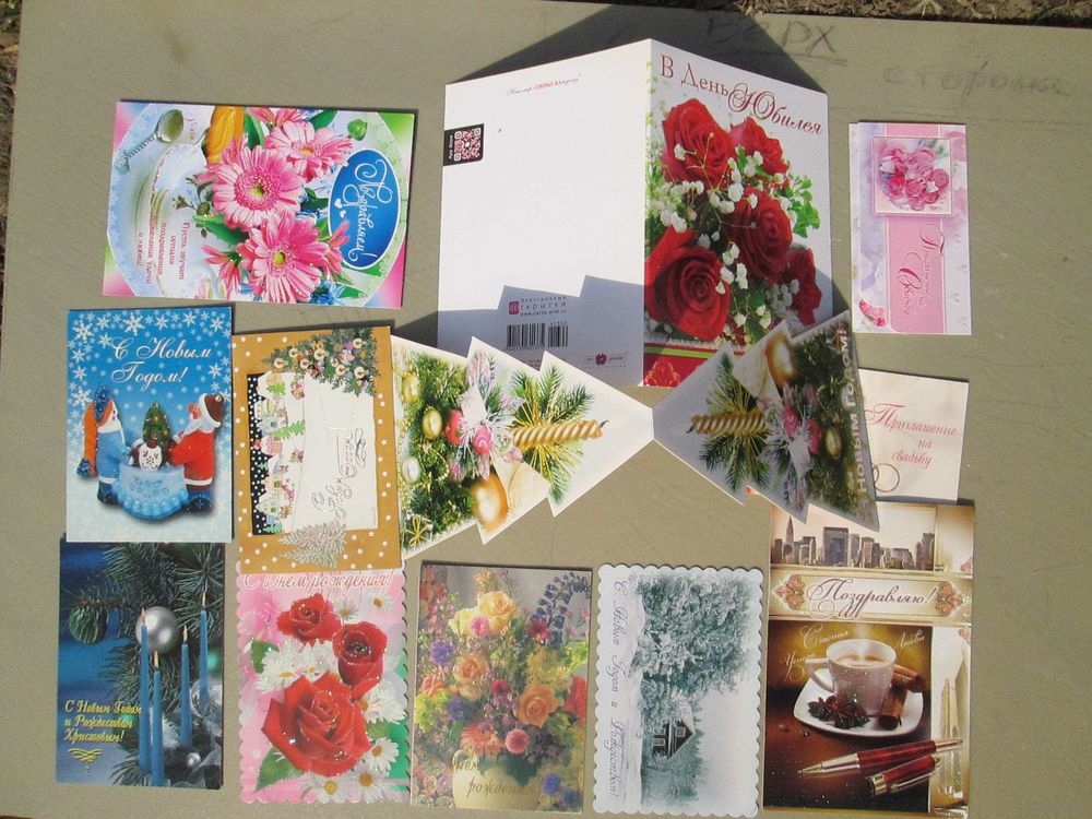 2 новые современные поздравительные открытки(на первом фото в центре) и бонусом к ним 10 подписанных поздравительных открыток в отличном состоянии и еще 40 открыток поздравительных б у, не подписанных, а с отклеенными или снятыми текстами поздравлений.