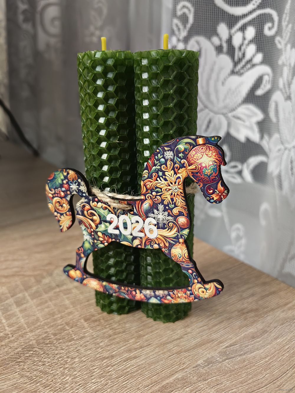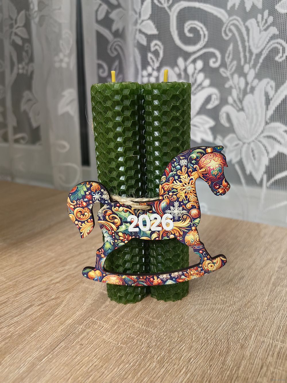 Свечи ручной работы из зеленой натуральной вощины- подарочный набор с деревянной лошадкой. Высота каждой свечи 13 см, диаметр 2,5 см. Подарите себе или своим близким оригинальный и натуральный подарок.