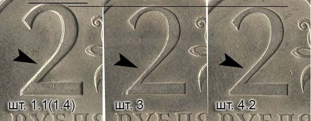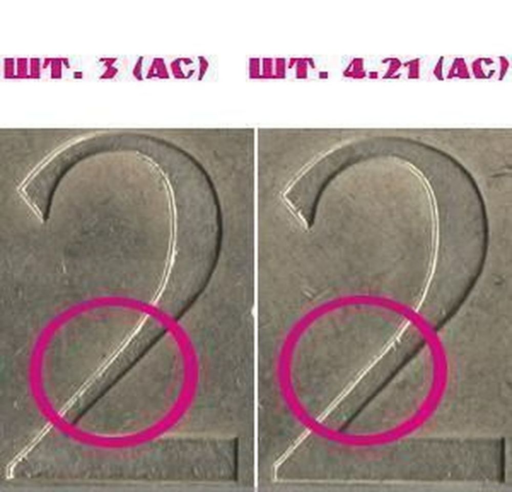 Единственной разновидностью, включённой Александром Сташкиным в группу "Нечастые", стала "Шт. 3" (по каталогу Юрия Кульвелиса "Шт. 2.1", пришедшая к нам из 2006 года). Отличить её несложно. Сначала убираем из поля обзора монеты с массивными двойками номинала, а после пристально вглядываемся в оставшиеся двойки. У частой "Шт. 4.21" диагональная перекладина номинала равномерно широкая, а нечастая "Шт. 3" являет нам заметно сужающуюся диагональную перекладину (фото №8)