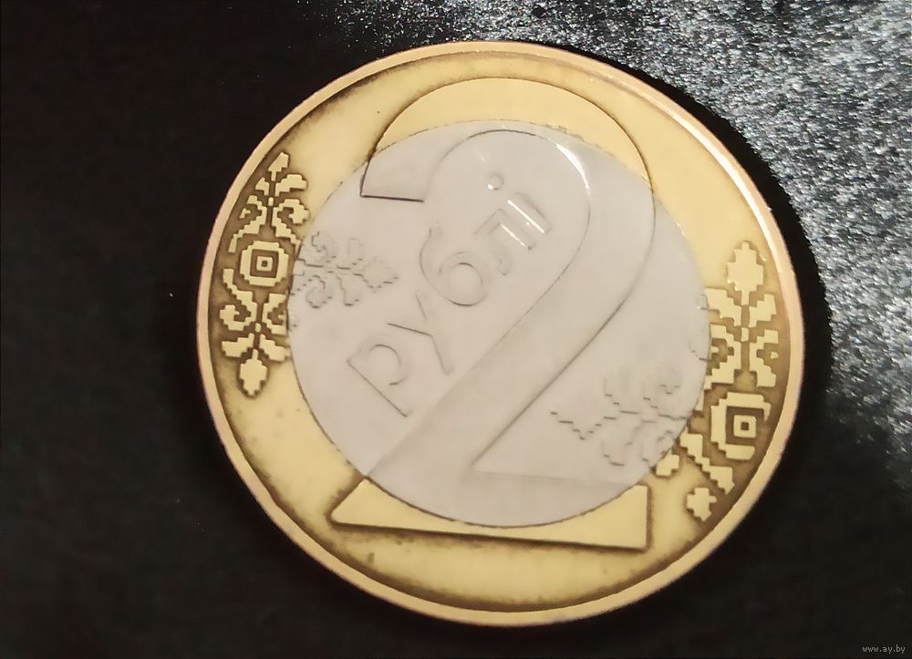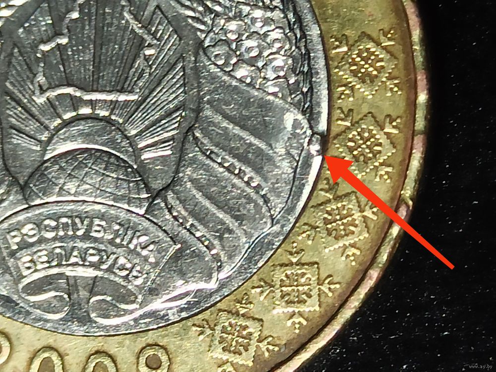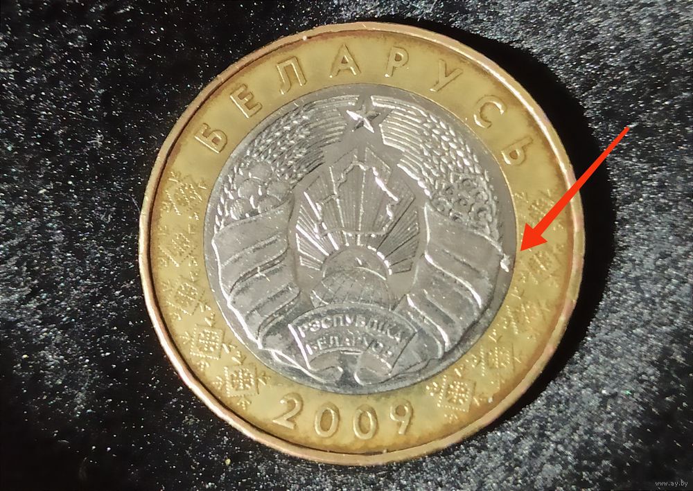 Монета 2 рубля РБ 2009 года. Дефект штамповки - "зёрнышко" правее герба.