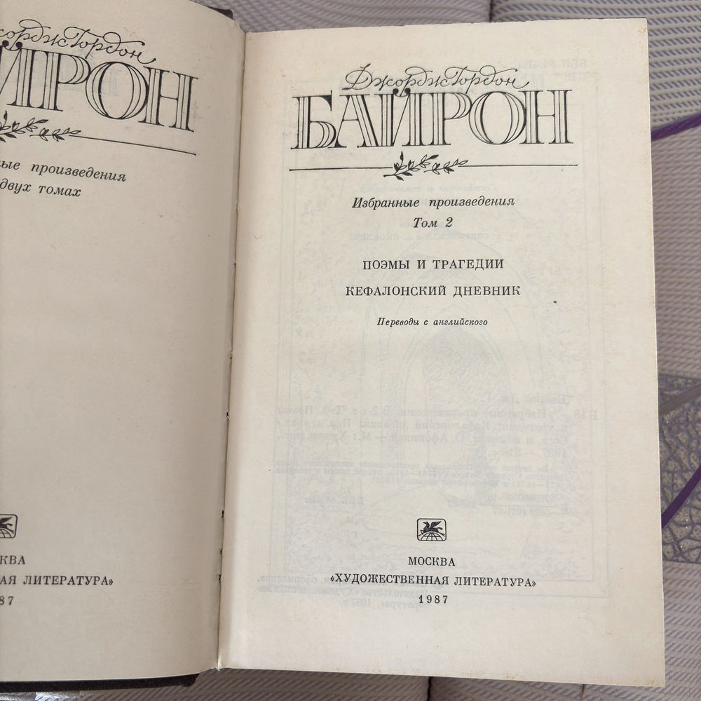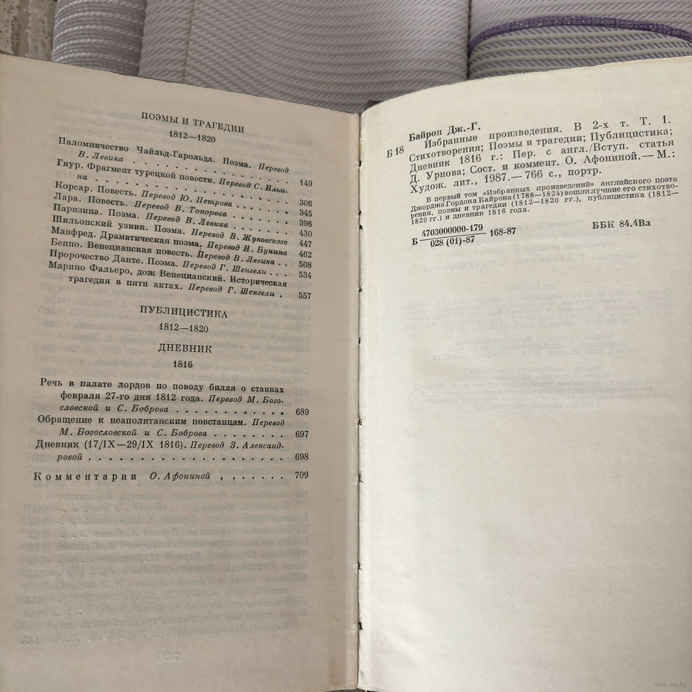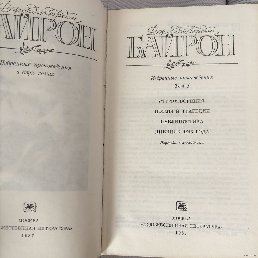 В первый том "Избранных произведений" (1987г.) английского поэта Джорджа Гордона Байрона (1788 - 1824) вошли лучшие его стихотворения, поэмы и трагедии (1812 - 1820 гг.), публицистика (1812 - 1820 гг. ) и дневник 1816 года.