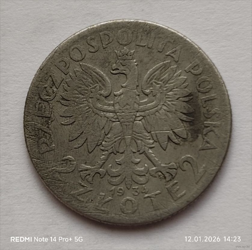 2 злотых, 1934 года, серебро 750 пробы