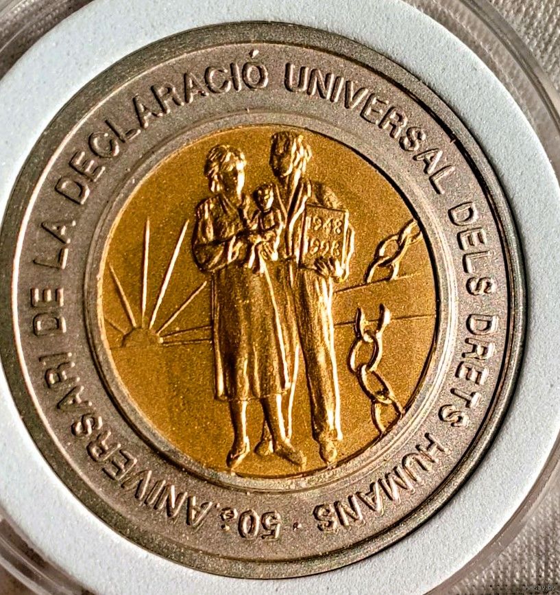 20 динеро 1998, Андорра "50-я годовщина принятия Декларации прав человека", вес монеты 25 г. (инкрустация золото 0.917 - 1,5г, диск монеты серебро 0.925), довольно редкая и интересная биметаллическая монета (тираж - 5т. экз.) с необычным дизайном и матированной поверхностью! Отличный экземпляр в коллекцию!