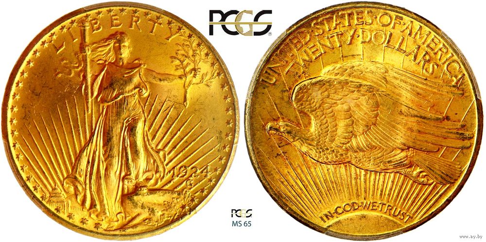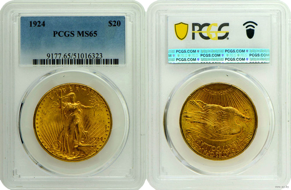 20 долларов 1924 г. Шагаюшая свобода. США. Золото. Превосходное коллекционное состояние. Яркий штемпельный блеск. Монета в слабе PCGS, сохранность MS 65!!! KM#131.