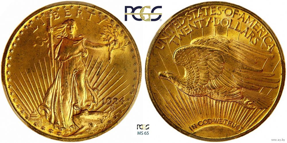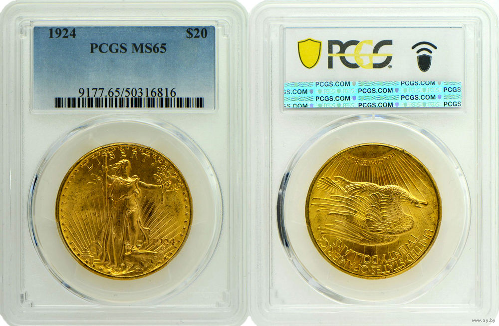 20 долларов 1924 г. Шагаюшая свобода. США. Золото. Превосходное коллекционное состояние. Яркий штемпельный блеск. Монета в слабе PCGS, сохранность MS 65!!! KM#131.