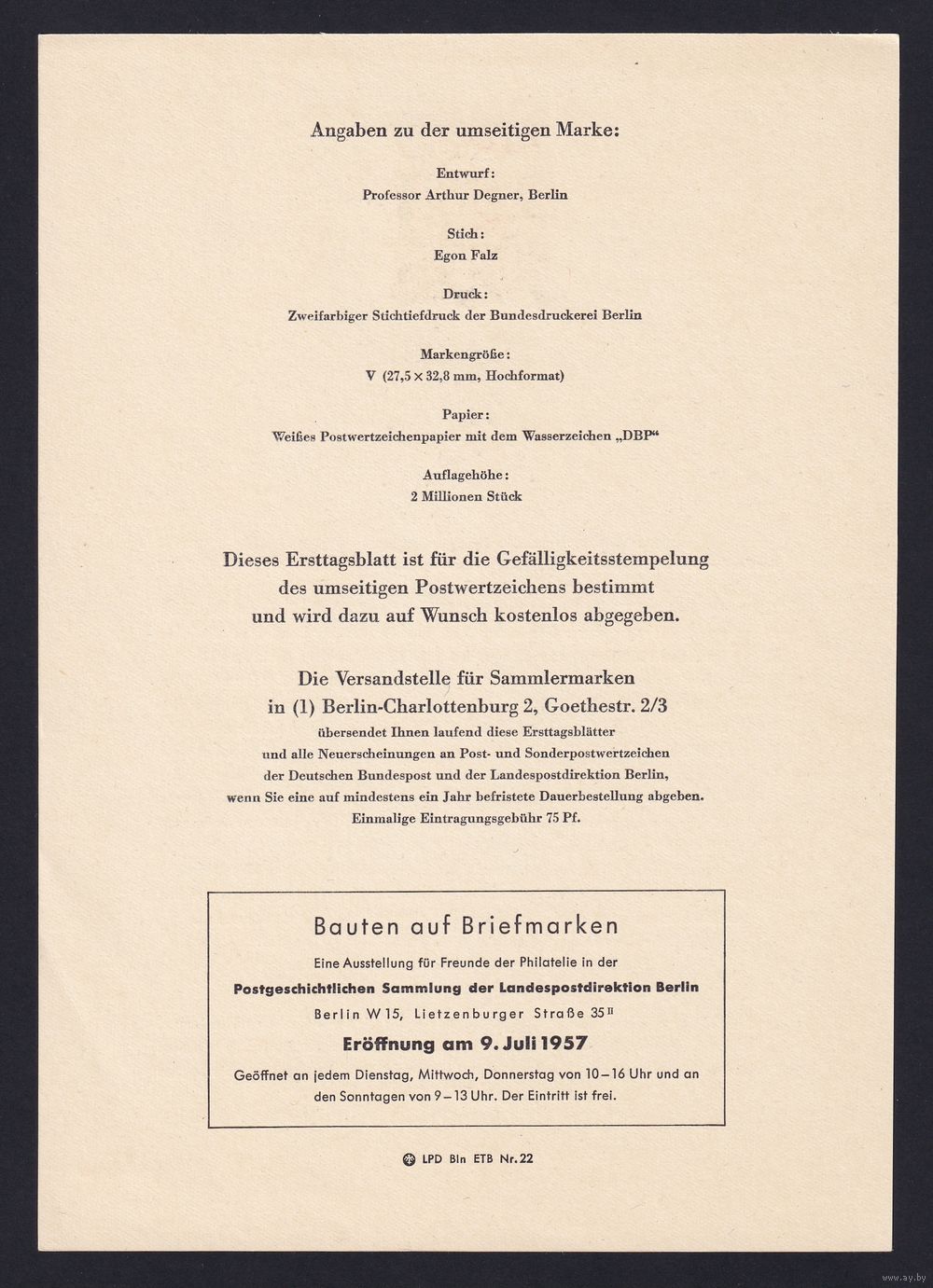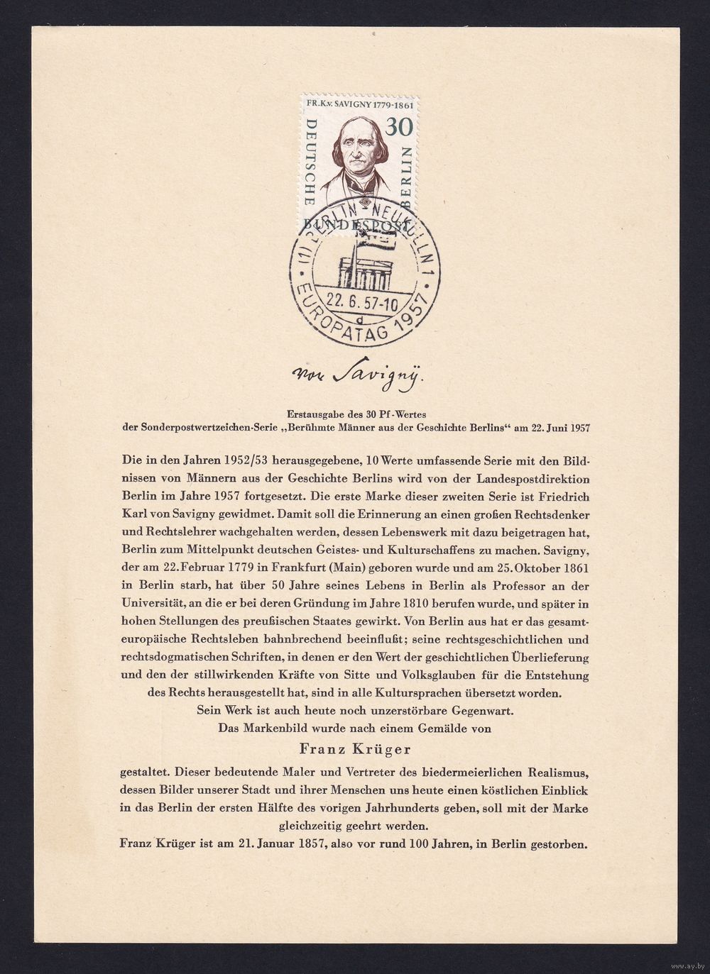 20.ETB. Германия. Западный Берлин. 1957 г. Люди из истории Берлина. Лист первого дня гашения. Mi.#170/ETB#22.