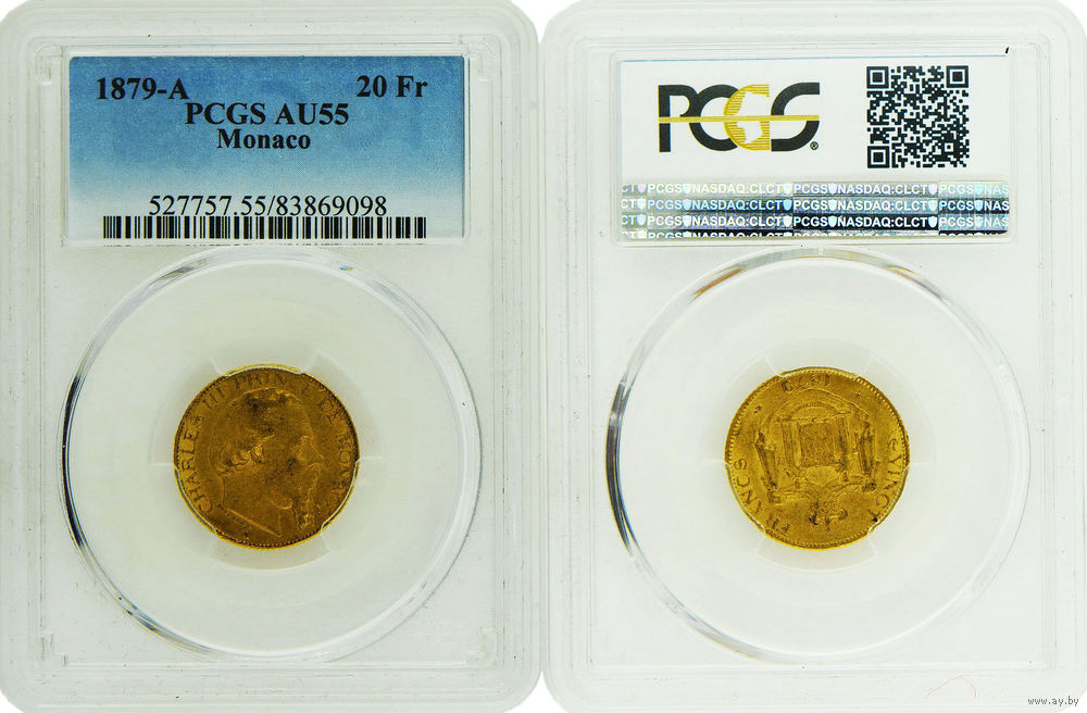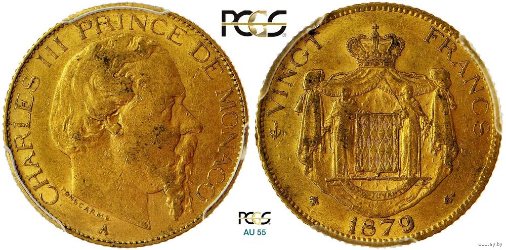 20 франков 1879 г. Карл III (1856-1889). Монако. Золото. Редкая монета в отличном коллекционном состоянии. Монета в слабе PCGS AU 55. Редкие. KM # 98.