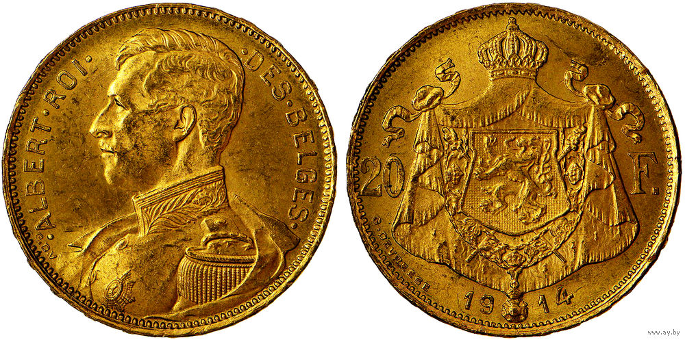 20 франков 1914 г. Король Альберт I (1910 - 1934). Бельгия. Редкие. Надпись на французском - 'ALBERT ROI DES BELGES'. Отличное коллекционное состояние, штемпельный блеск. Краузе #78.