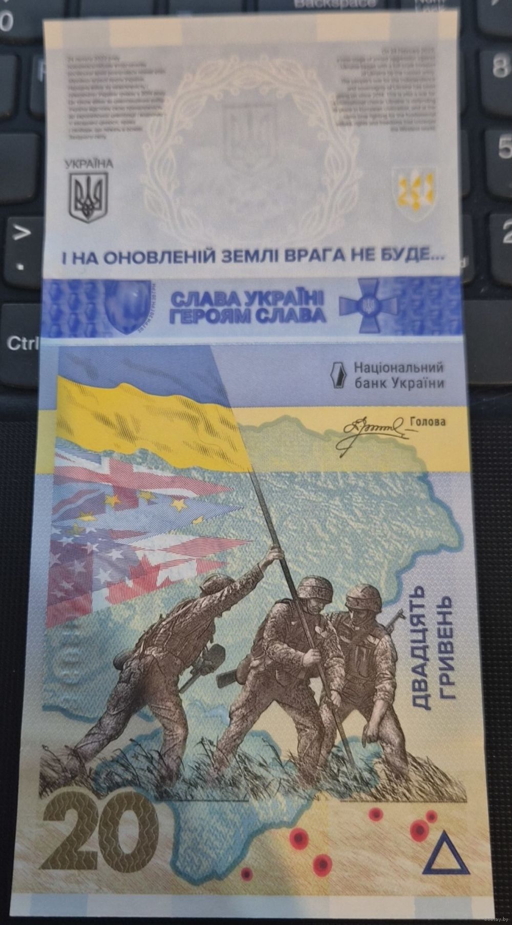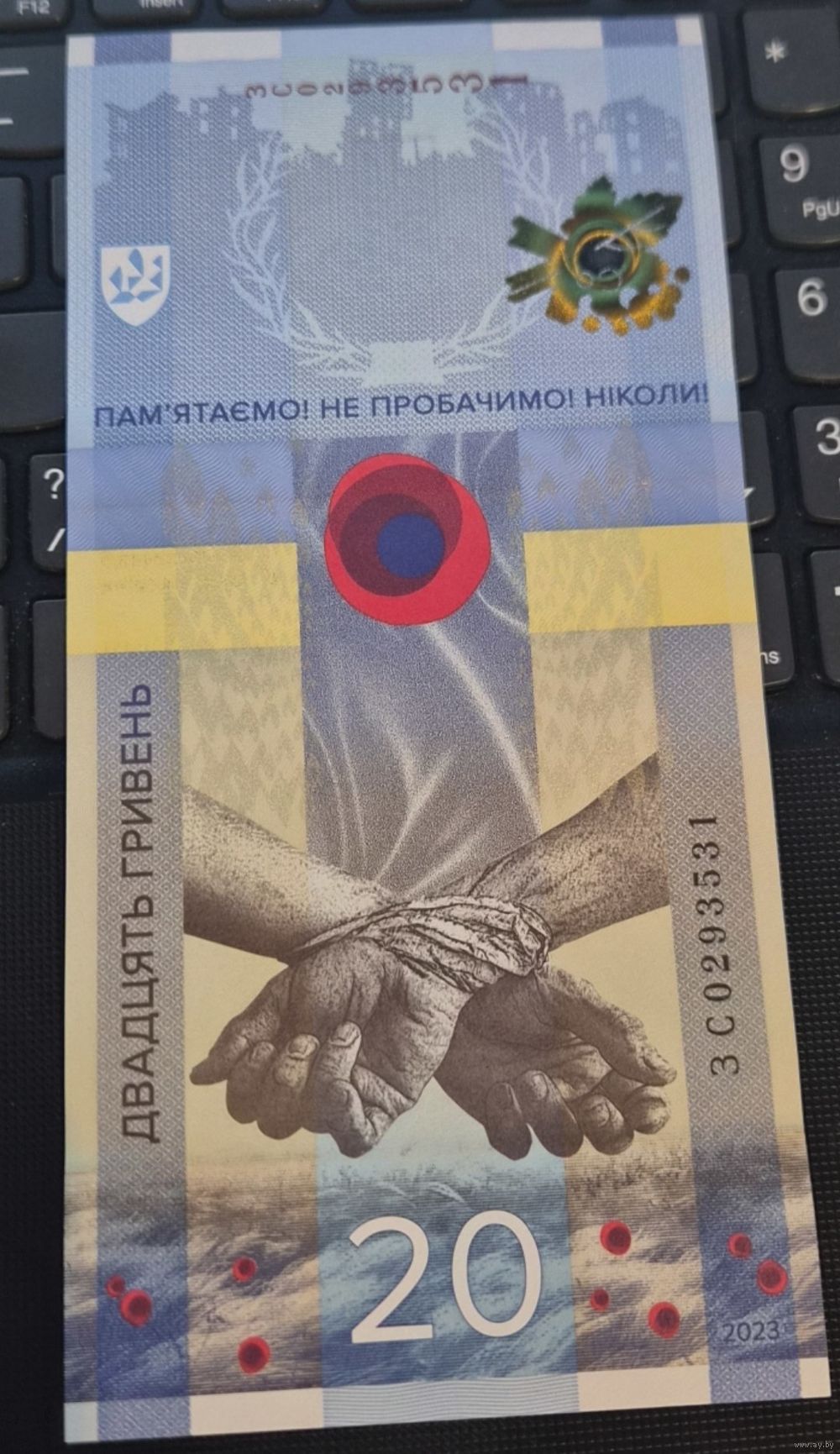 Памятная банкнота Украины номиналом 20 гривен 2023 года выпуска. Банкнота называется "Помним! Не простим!" и вышла как напоминание о войне за независимость и суверенитет Украины. Дизайн создан заслуженным художником Украины Владимиром Таран.
