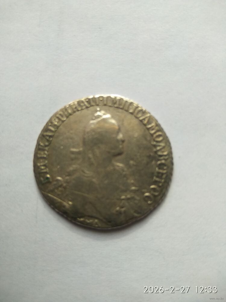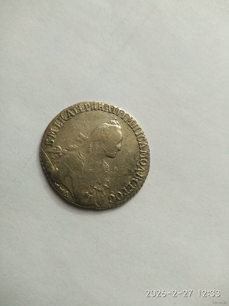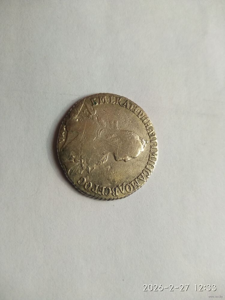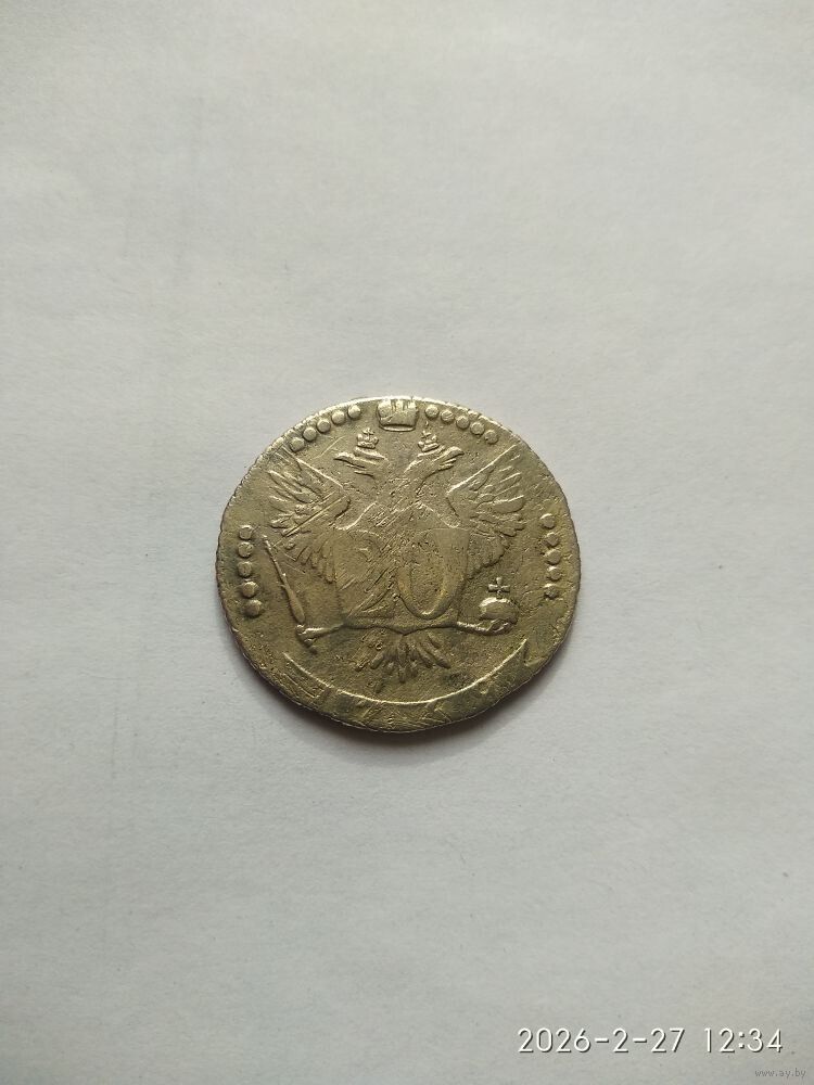Аверс: в центре портрет Екатерины II, обращенный вправо, в обрезе плеча инициалы медальера «TI» (Тимофей Иванов), под ним обозначение монетного двора «СПБ», вверху вдоль края монеты надпись «Б.М.ЕКАТЕРИНА.II.ИМП.ИСАМОД.ВСЕРОС» (Божьей милостью Екатерина II Императрица и Самодержица Всероссийская).