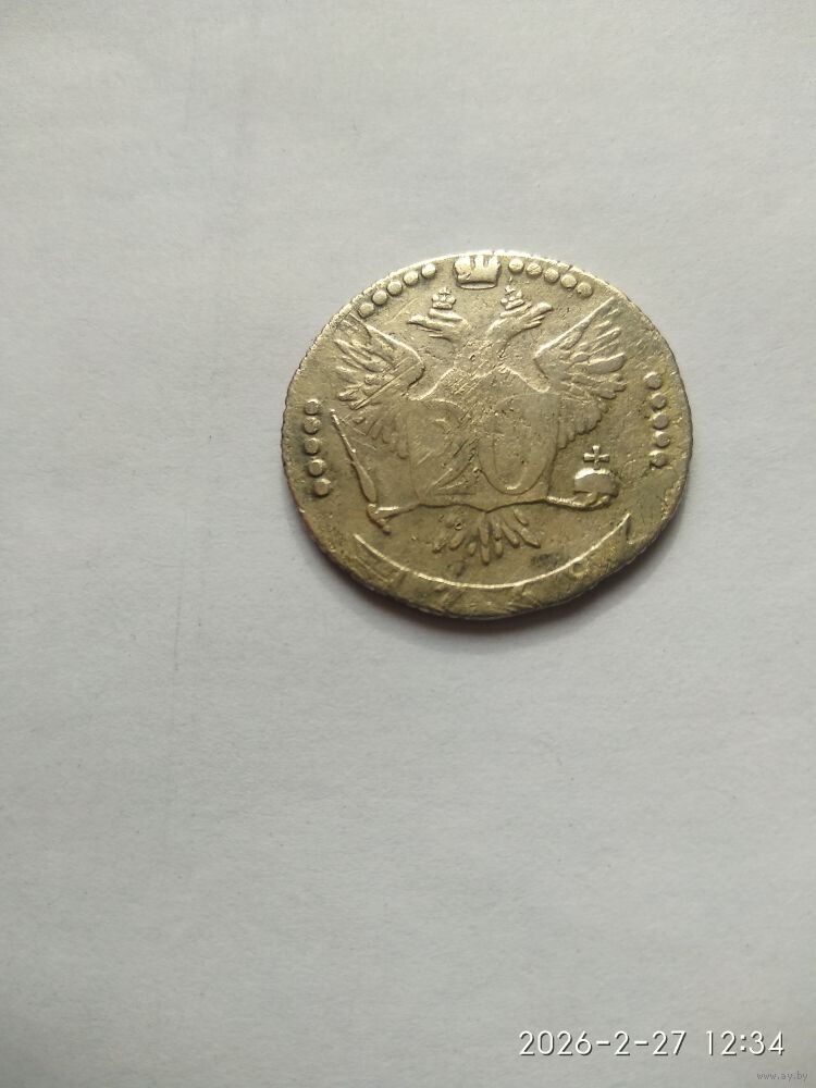 Реверс: в центре - Герб Российской империи – двуглавый орел со скипетром и державой, увенчанный императорской короной, слева и справа от неё – по пять точек, слева и справа вдоль края монеты – по пять точек. На груди орла, на узорном щите, указан номинал – «20». Внизу по краю монеты – лента с годом выпуска - «1768».