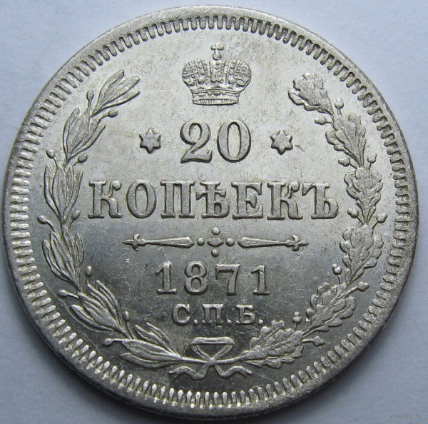 20 КОПЕЕК 1871 СПБ-НI ШТЕМПЕЛЬНЫЙ БЛЕСК, КЛАДОВЫЙ СОХРАН