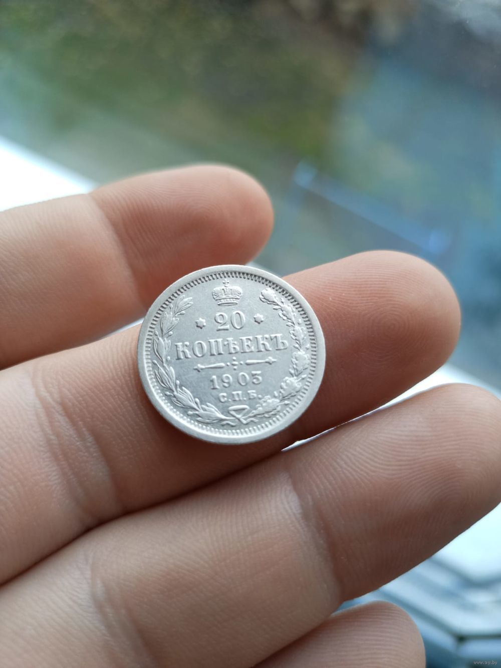 Реверс: слева вдоль края монеты лавровая ветвь, справа дубовая, внизу ветви соединяются и перевязаны лентой, в середине вверху Корона Российской империи, под ней обрамленный слева и справа звездочками номинал монеты - цифра «20», ниже слово «КОПЕЕК», под ним две направленные в разные стороны фигурные черты и ниже год выпуска монеты «1903», под ним обозначение монетного двора «СПБ».