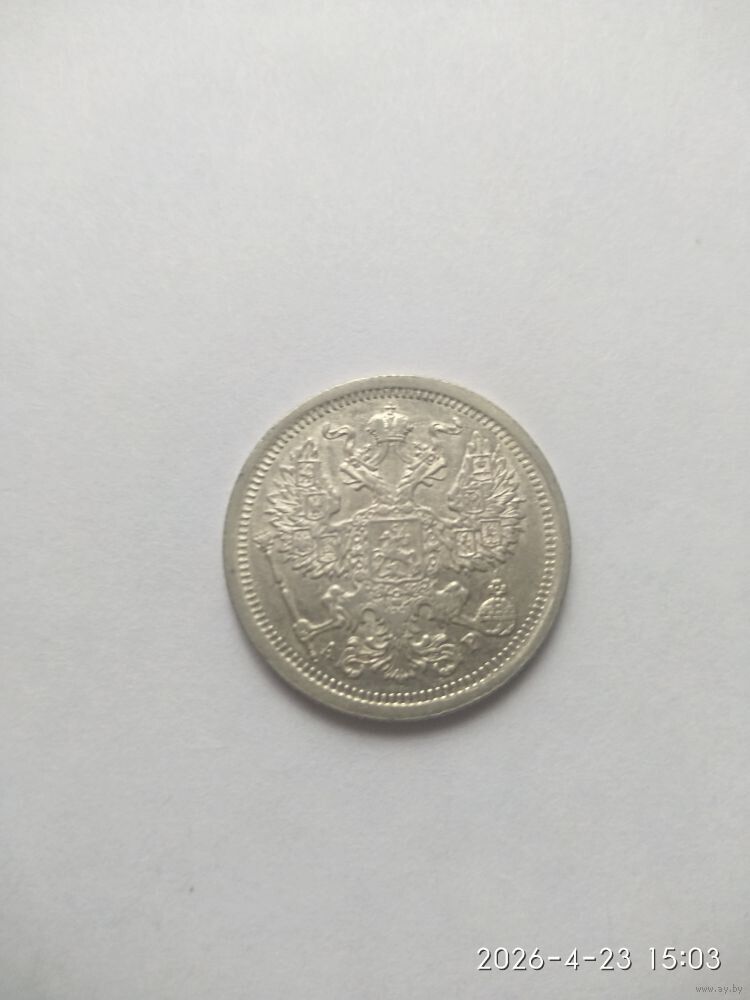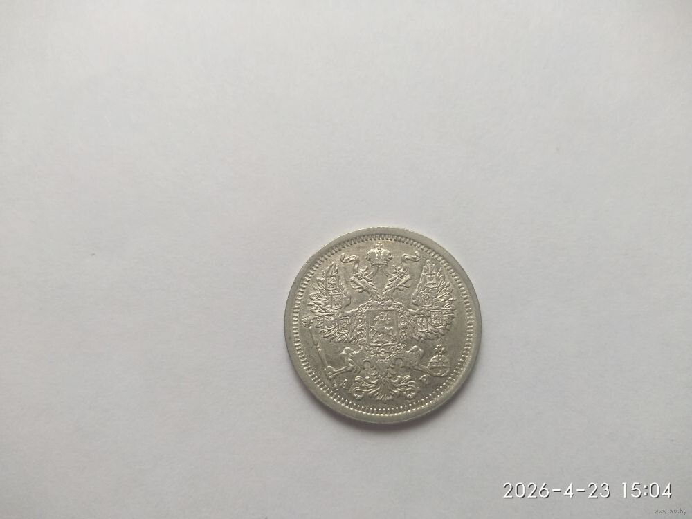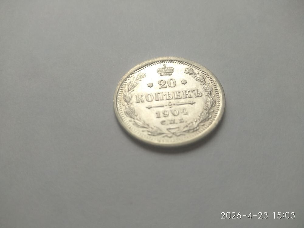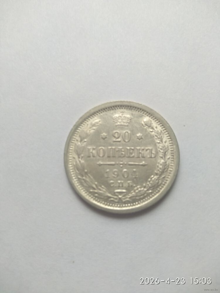 Аверс: В верхней части Реверс:а расположена корона Российской империи. Ниже на двух строках обозначен номинал (слева и справа шестиконечные звёзды) и денежная единица : 20 КОПѢЕКЪ Ниже находится элемент — разделитель, состоящий из двух разнонаправленных стрелок и пяти точек между ними. Пять точек образуют крест. Под разделителем — год чеканки «1904». Под годом аббревиатура «С.П.Б.» (Санкт-Петербургский монетный двор). В левой части монеты вдоль края находится лавровая ветвь, а в правой дубовая. У основания ветви связаны лентой, которая образует аккуратный бант. По всему краю монеты отчеканены выступающие зубцы.