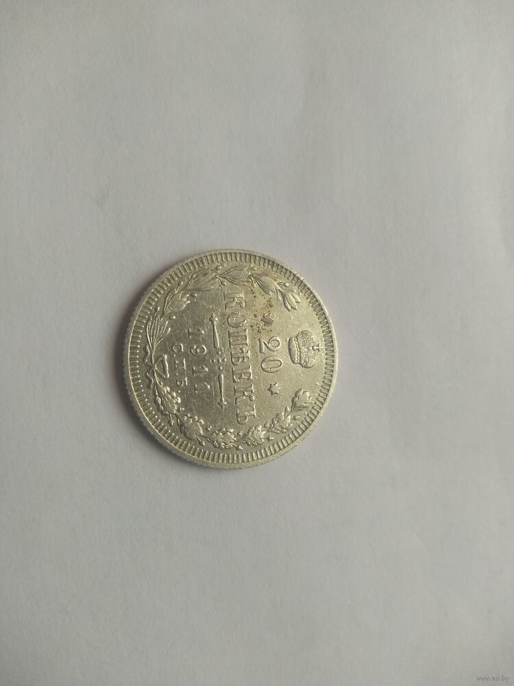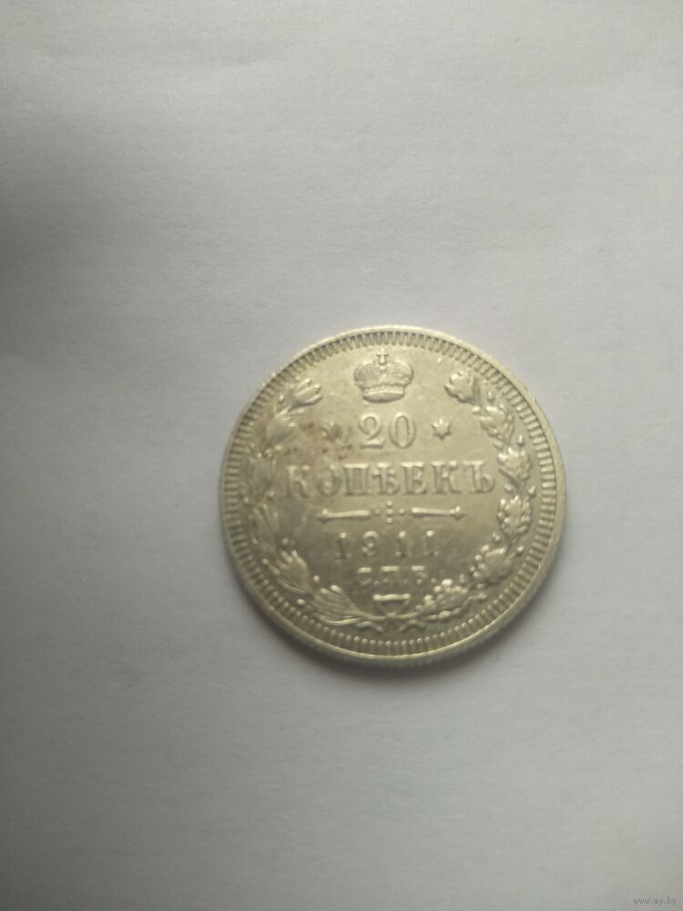 Реверс: слева вдоль края монеты лавровая ветвь, справа дубовая, внизу ветви соединяются и перевязаны лентой, в середине вверху Корона Российской империи, под ней обрамленный слева и справа звездочками номинал монеты - цифра «20», ниже слово «КОПЕЕК», под ним две направленные в разные стороны фигурные черты и ниже год выпуска монеты «1911», под ним обозначение монетного двора «СПБ».