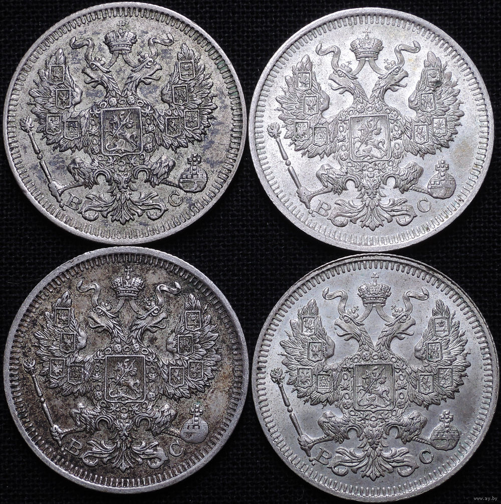 20 копеек 1913-1915, 4 штуки, aUNC-UNC, Отличные! С 1 Рубля! Смотрите другие лоты!