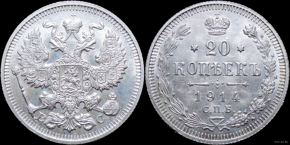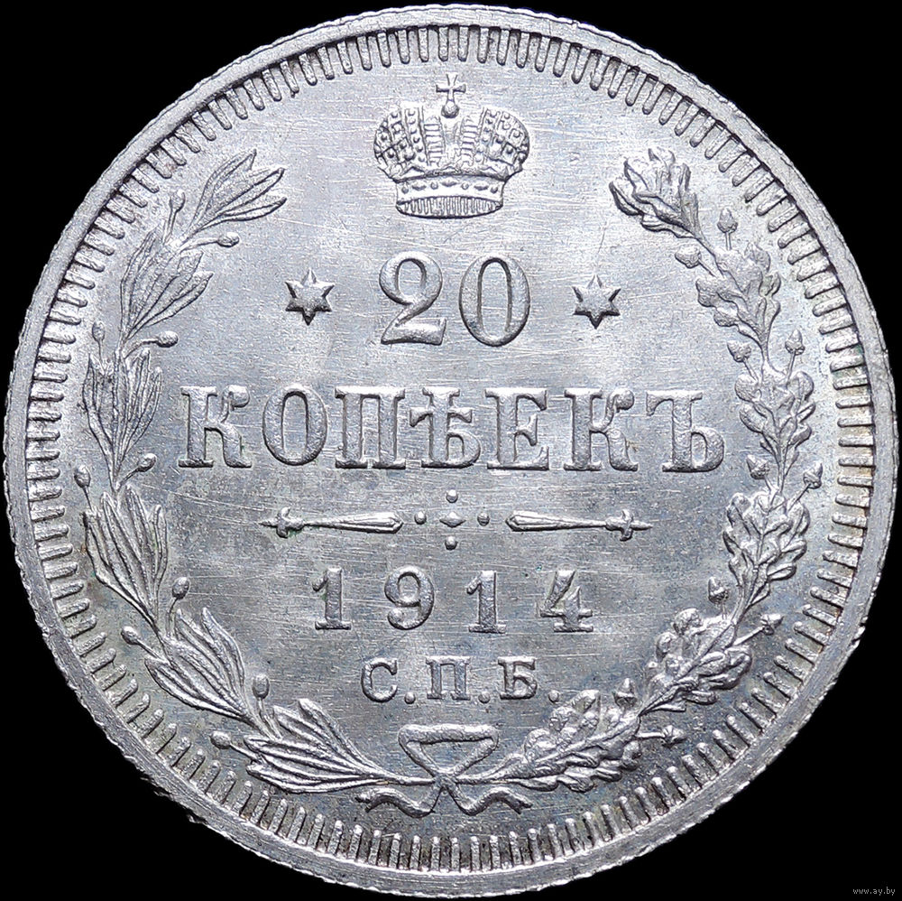 20 копеек 1914, UNC, Штемпельный блеск! С 1 Рубля! Смотрите другие лоты!
