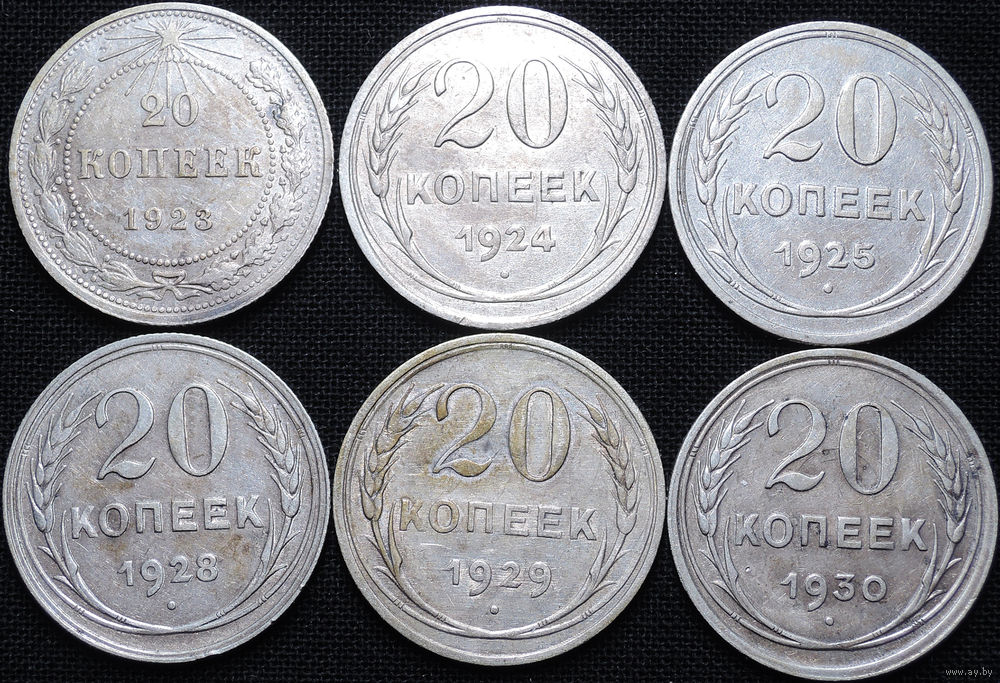 20 копеек 1923-1930, 6 штук, aUNC-UNC, Отличные! С 1 Рубля! Смотрите другие лоты!