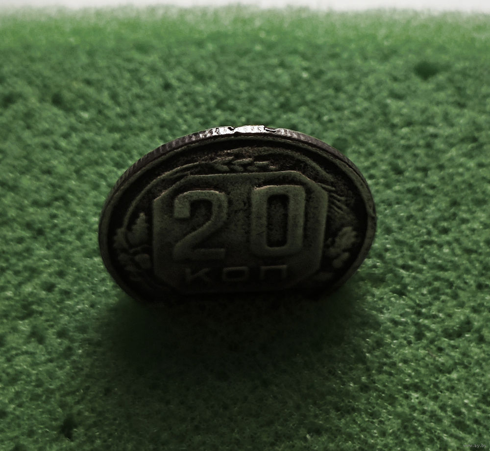 Перед нами монета 20 копеек, выпущенная в 1937 году, в 1937 году введена в обращение.