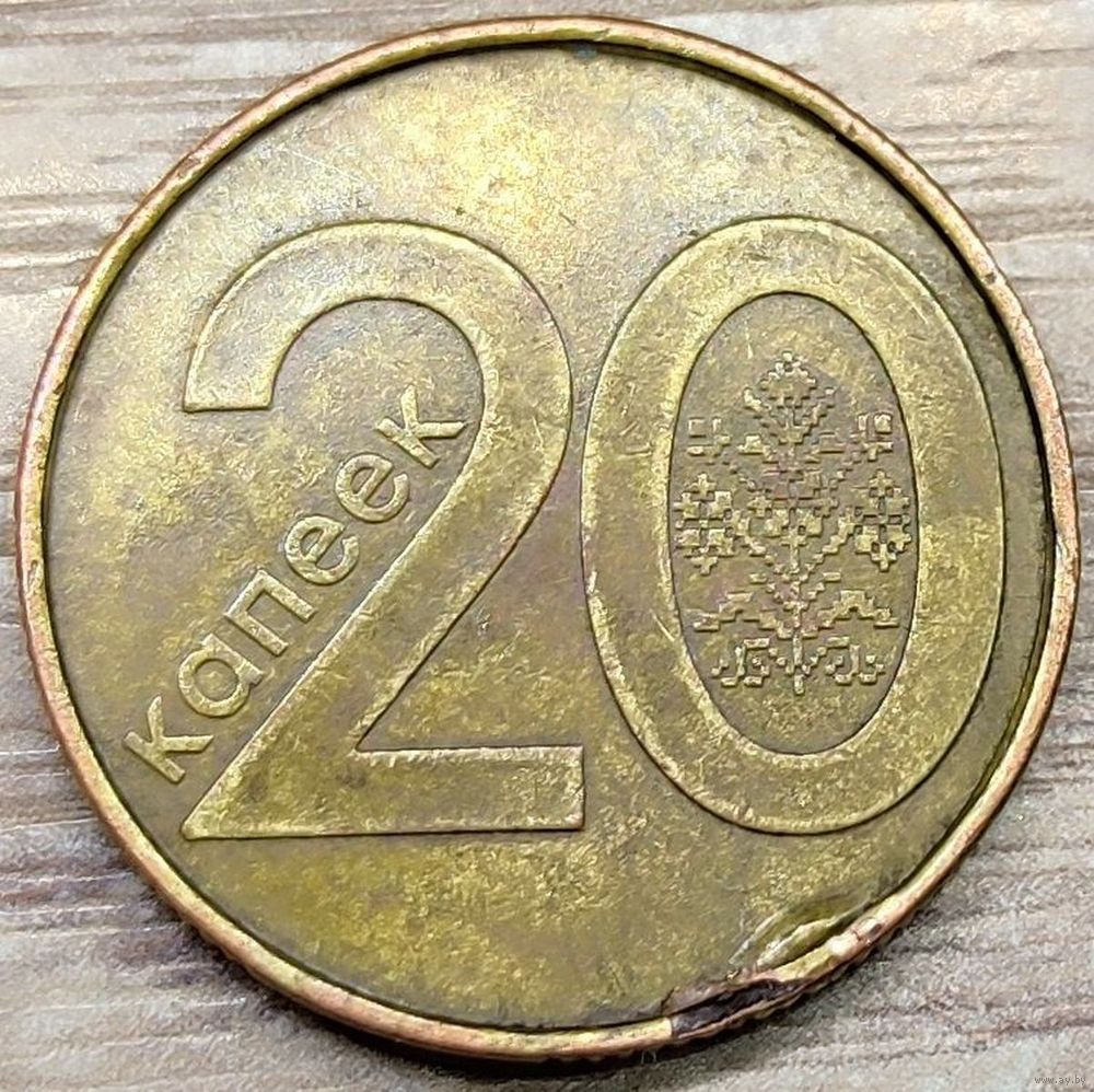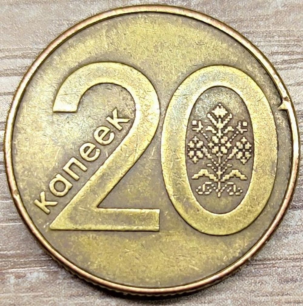 Описание реверса: В центре – цифровое обозначение номинала – «20», слева от цифры 2 по диагонали расположена надпись – «КАПЕЕК»; в цифре 0 – стилизованное изображение национального орнамента