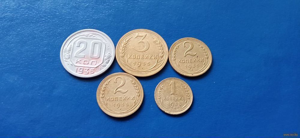 20 копеек,3 копейки нов.тип,2 копейки ст.и новый тип и 1 копейка ст.тип 1935 год СССР (Состояние на фото)В лоте 5 монет