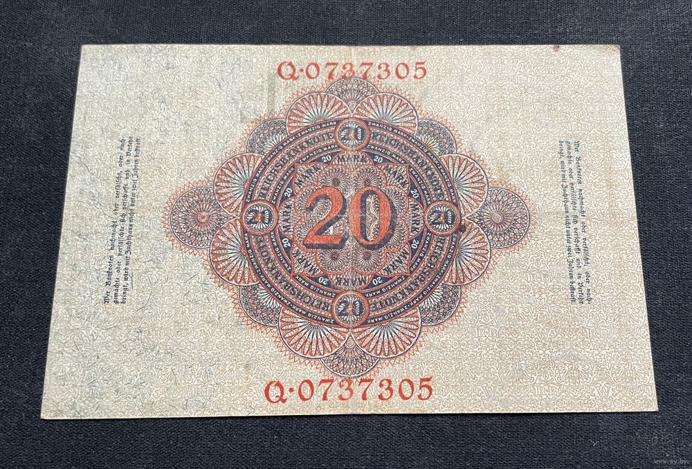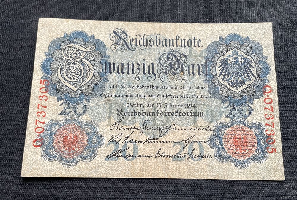 Эмісіі Рэйхсбанка (Reichsbank) Германскай Імперыі. Імперскія банкноты (Reichsbanknote) 20 Mark. Тып 1906 г. Імперскія банкноты 20 марак тып 1906 г. канфіскаваны з абарачэння 05.07.1925 г.