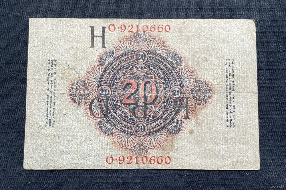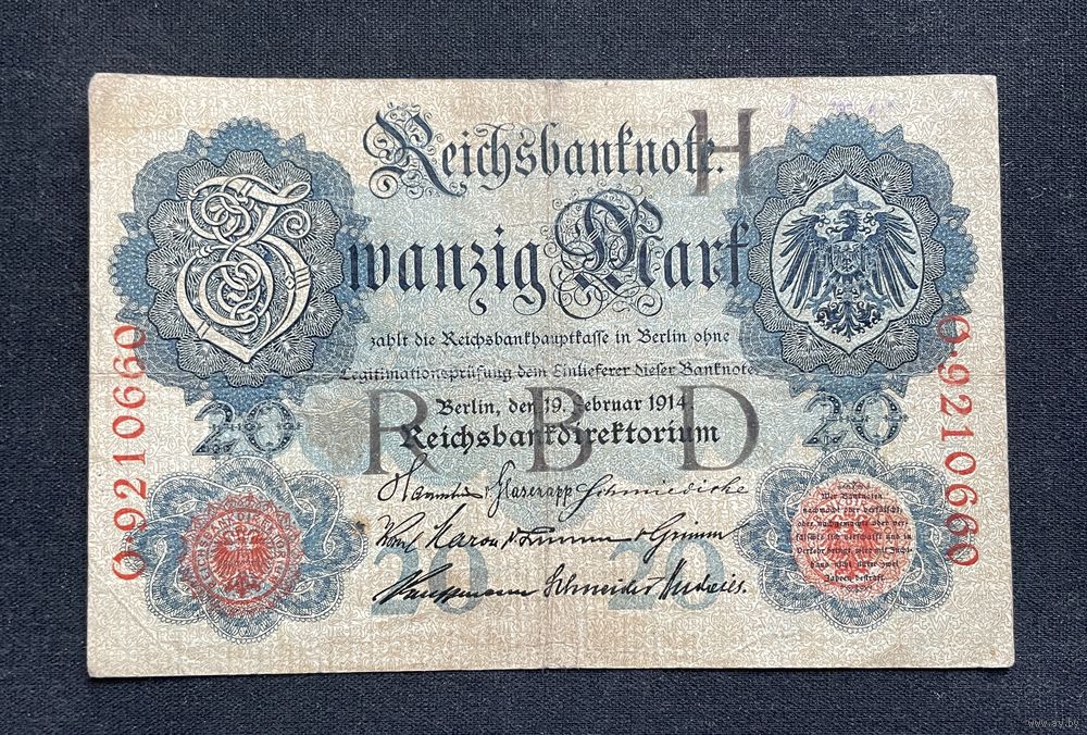 Эмісіі Рэйхсбанка (Reichsbank) Германскай Імперыі. Імперскія банкноты (Reichsbanknote) 20 Mark. Тып 1906 г. Імперскія банкноты 20 марак тып 1906 г. канфіскаваны з абарачэння 05.07.1925 г.