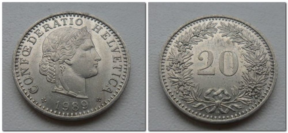 20 рапен Швейцария 1989 год, KM# 29a, 20 RAPPEN, из коллекции