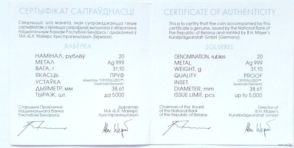 20 рублей 2009 г.Вавёрка.Серебро 999 Кристал Swarovski.