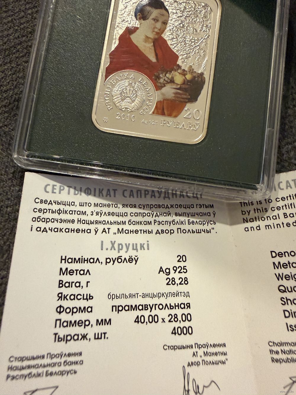 20 Рублей 2010г. И. Хруцкий. Беларусь. 28,28гр. СЕРЕБРО 925пр. Распродажа коллекции!!!