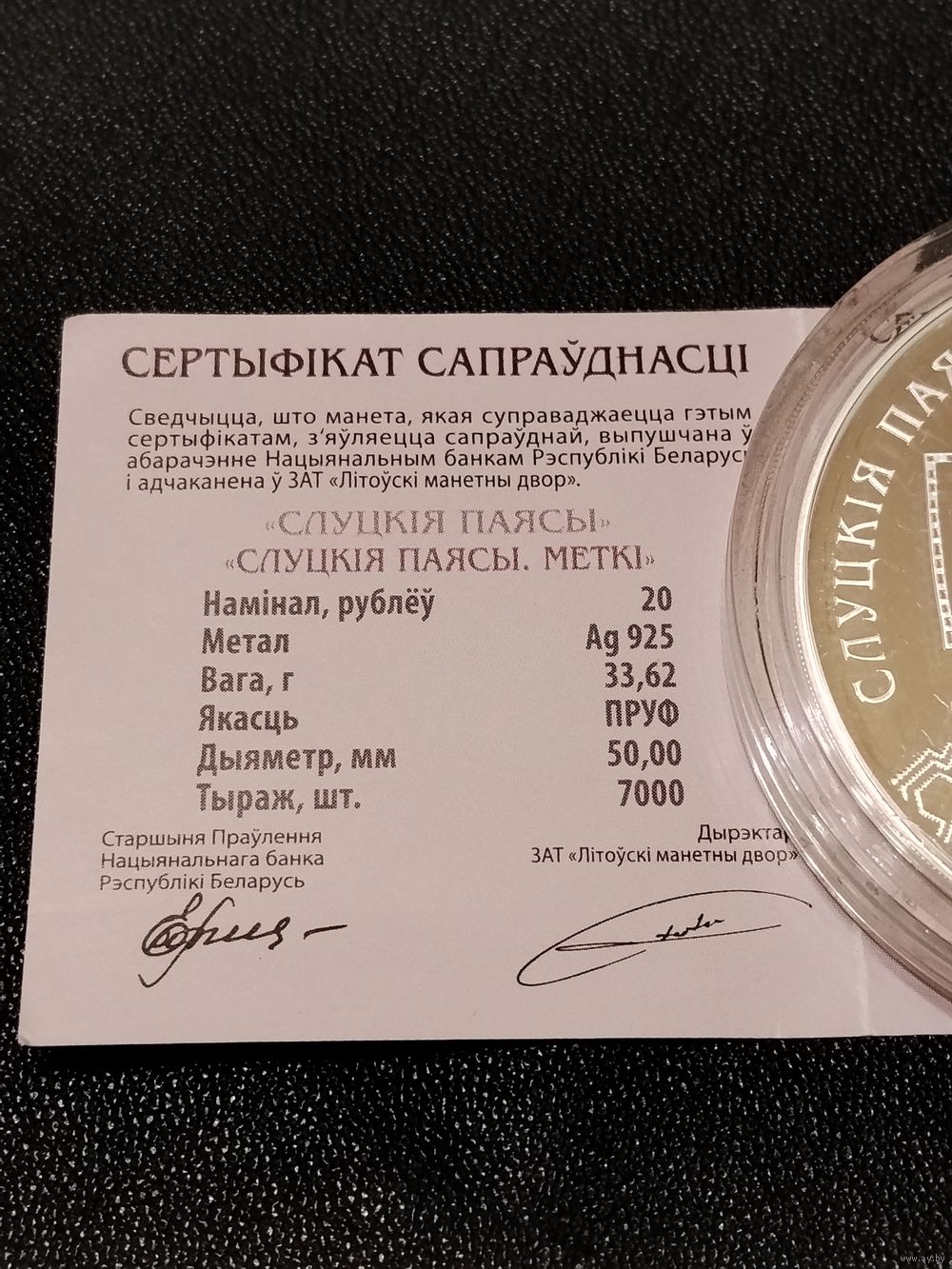 20 рублей 2013 г. Слуцкие пояса. Метки. Серебро 0.925. В продаже три монеты из пяти серии Слуцкие пояса. С 1 рубля.