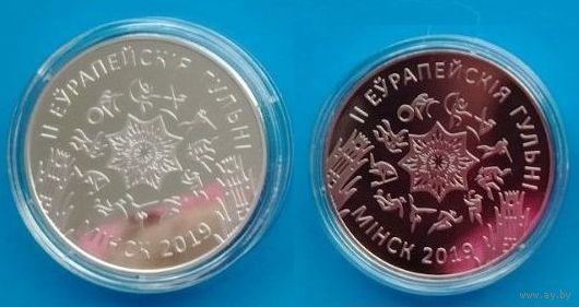 · II Европейские игры 2019 года. Минск Серебряная проба серебра: 925 номинал: 20 рублей масса монеты: 33,63 г. масса серебра в чистоте: 31,1 г. качество: "пруф" диаметр: 38,61 мм. тираж: 1 500 шт. Медно–никелевая номинал: 1 рубль масса монеты: 19,5 г. качество: "пруф-лайк" диаметр: 37 мм. тираж: 3 000 шт.