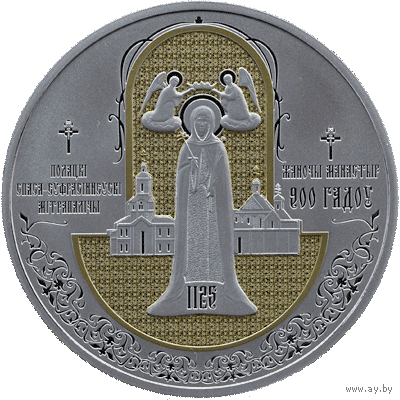 слева стилизованное изображение креста и надпись ”ПОЛАЦКІ СПАСА-ЕЎФРАСІННЕЎСКІ МІТРАПАЛІЧЫ“, справа стилизованное изображение креста и надпись ”ЖАНОЧЫ МАНАСТЫР 900 ГАДОЎ“; в центре – стилизованное изображение ангелов, коронующих Евфросинию Полоцкую на фоне женского монастыря, и год его создания ”1125“; внизу – орнамент по кругу.