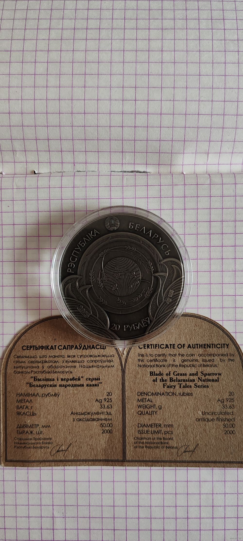 20 рублей 2025 "Травинка и воробей" серии "Белорусские народные сказки серебро республика Беларусь"