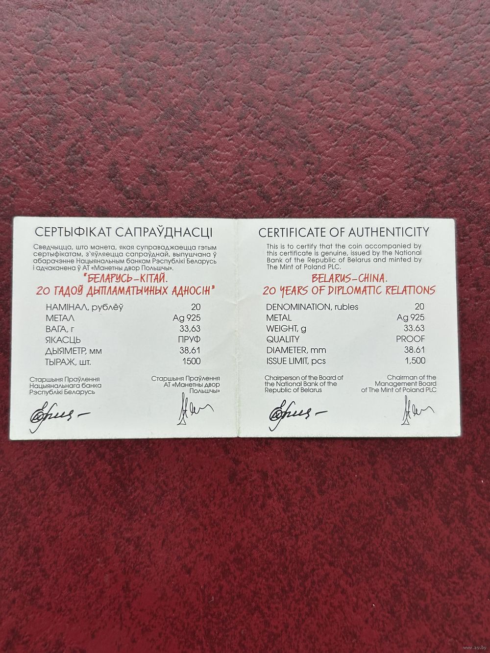20 рублей, Беларусь – Китай. 20 лет дипломатических отношений. 2012 год
