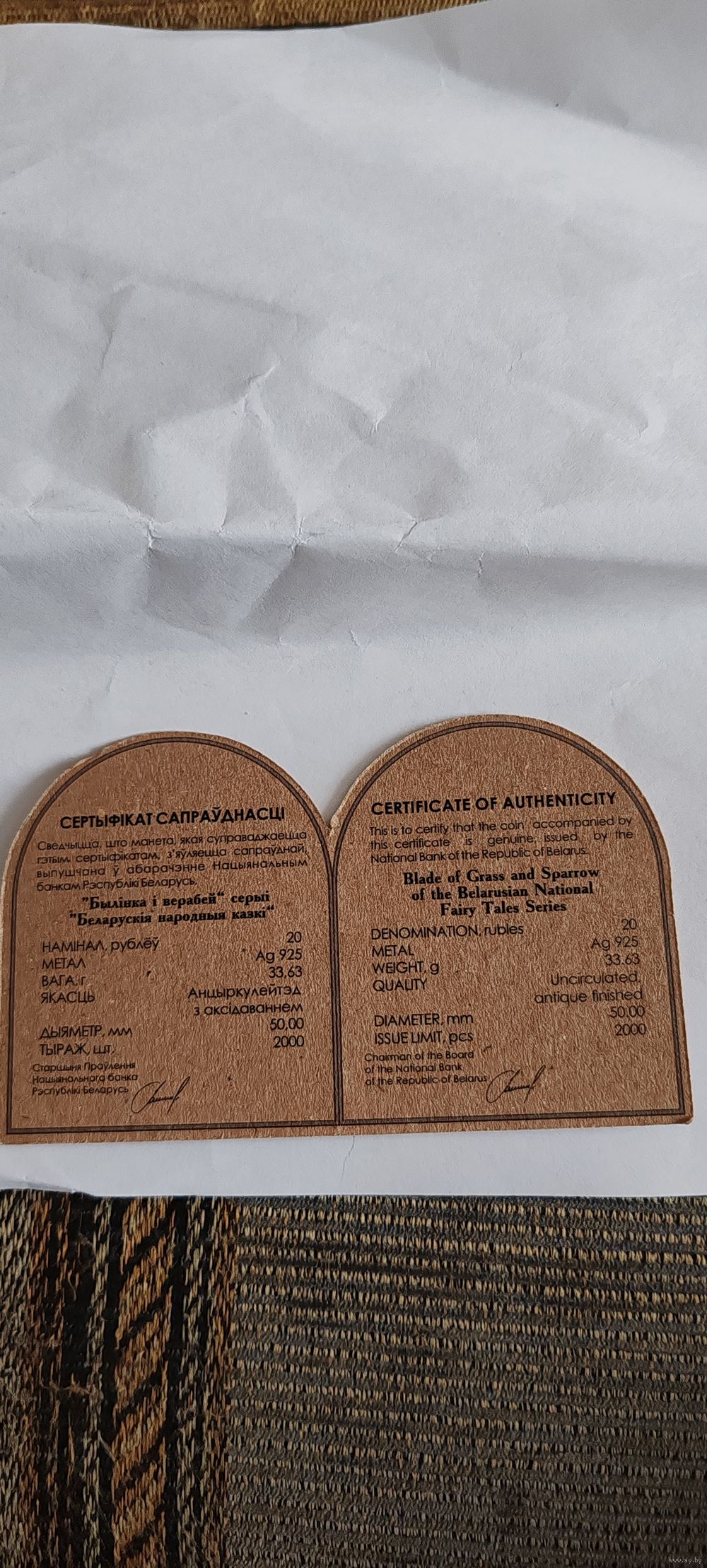20 рублей серебро 2025г. Травинка и воробей серии белорусские народные сказки Республика Беларусь