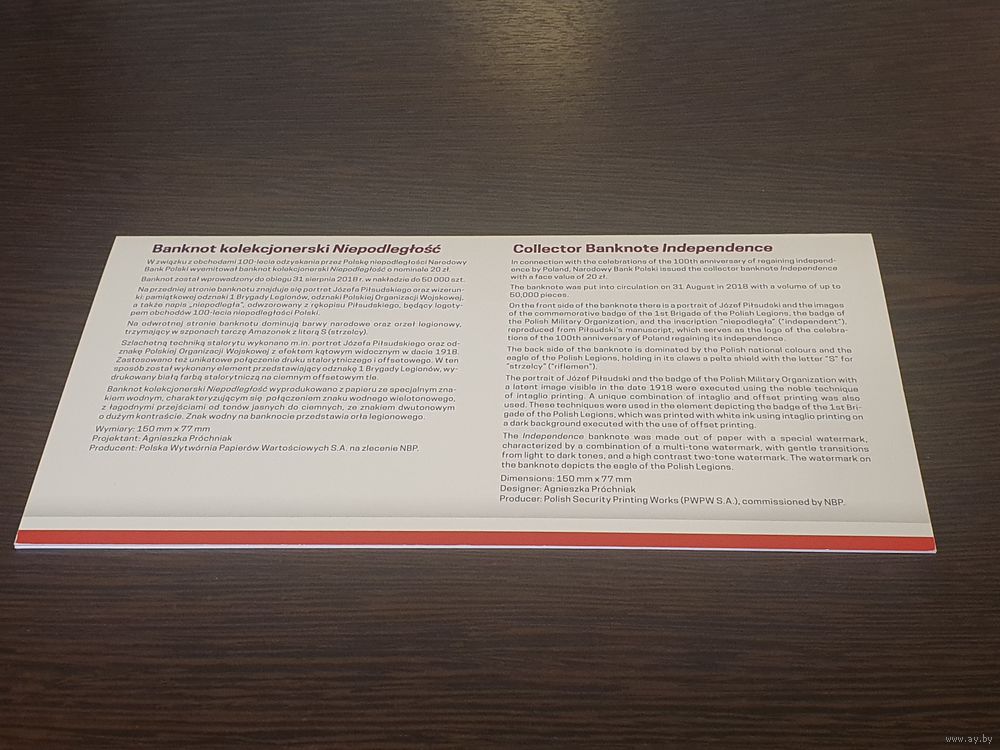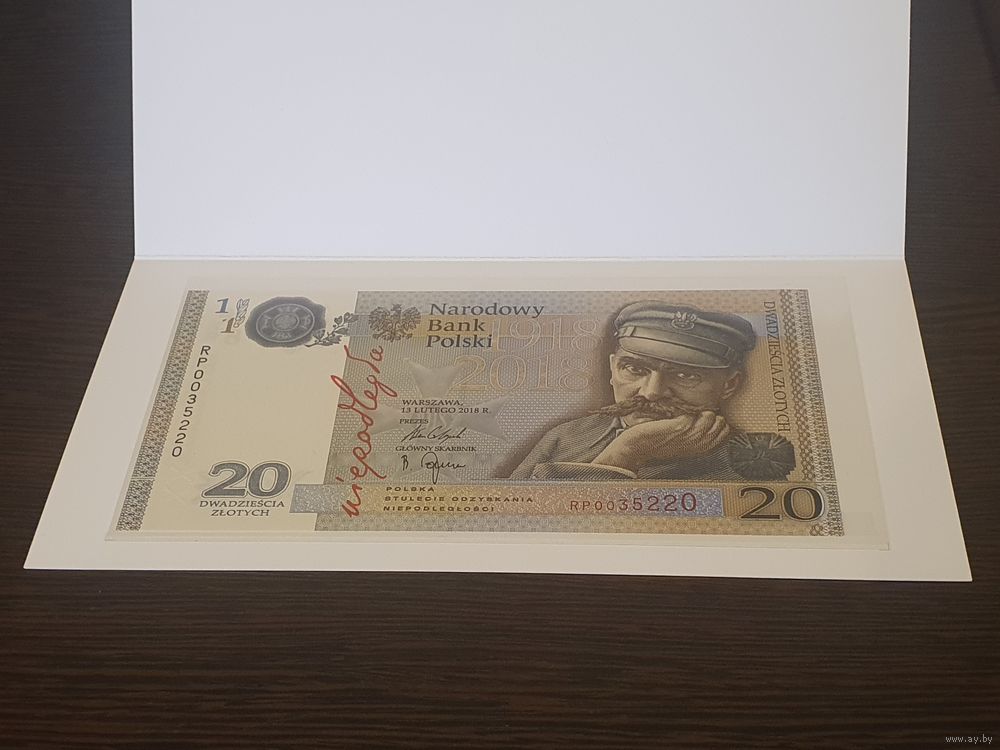 20 злотых Польша. 100-летие независимости Польши. Памятная банкнота Народного Банка Польши. 2018 год. UNC.