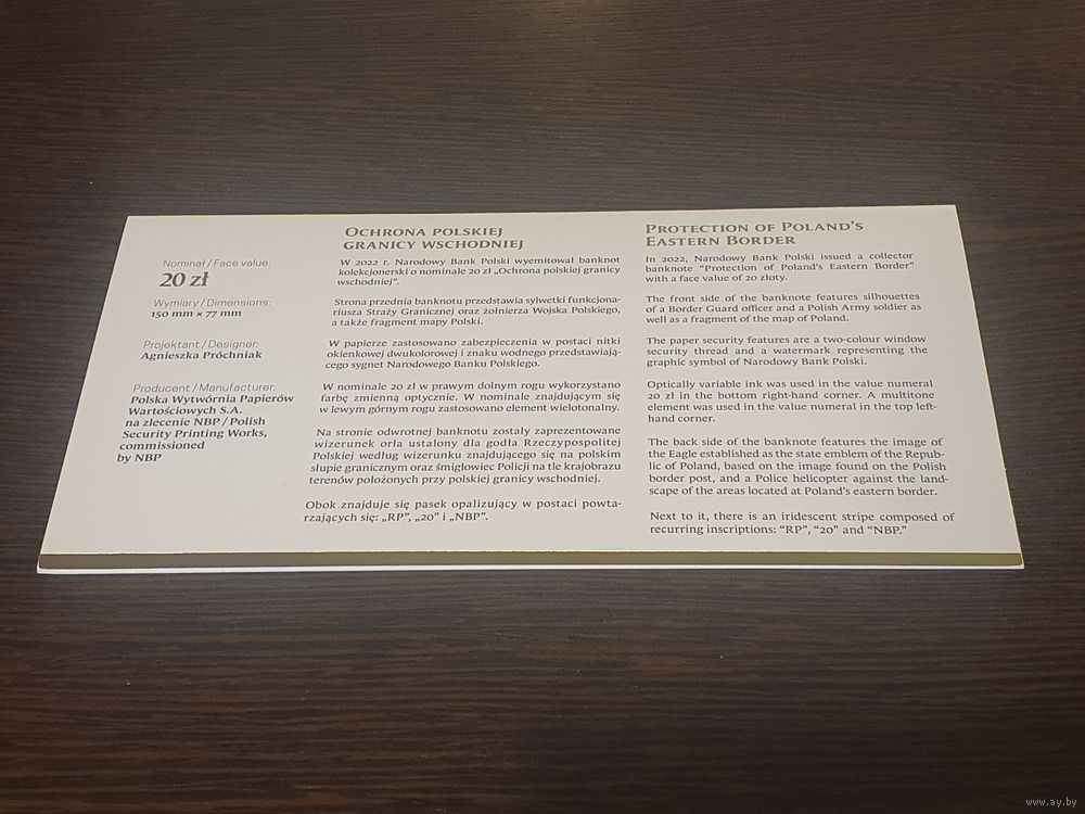 20 злотых Польша. Охрана границы Польши. Памятная банкнота Народного Банка Польши. 2022 год. UNC.