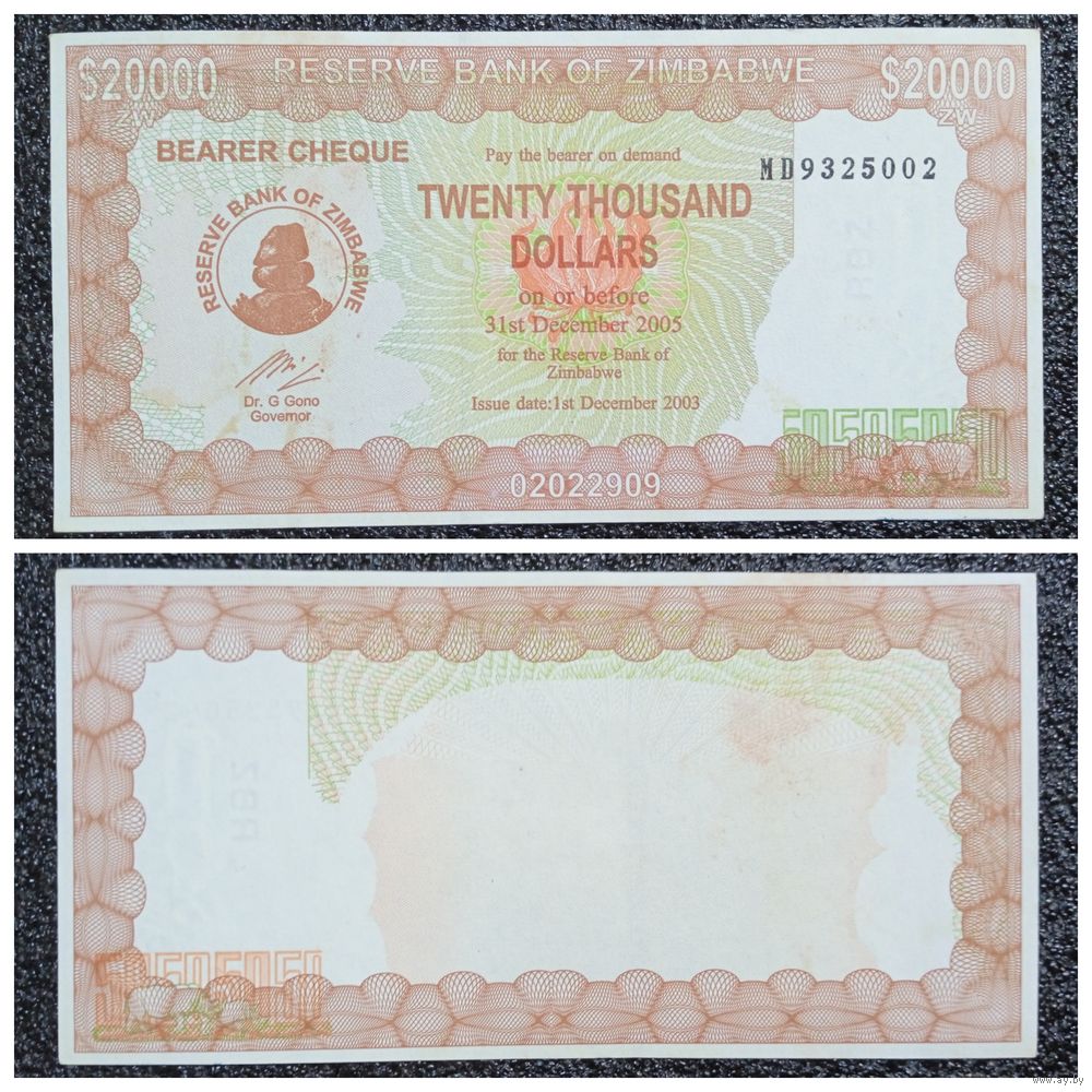 20000 долларов Зимбабве 2003 г. (чек на предъявителя)