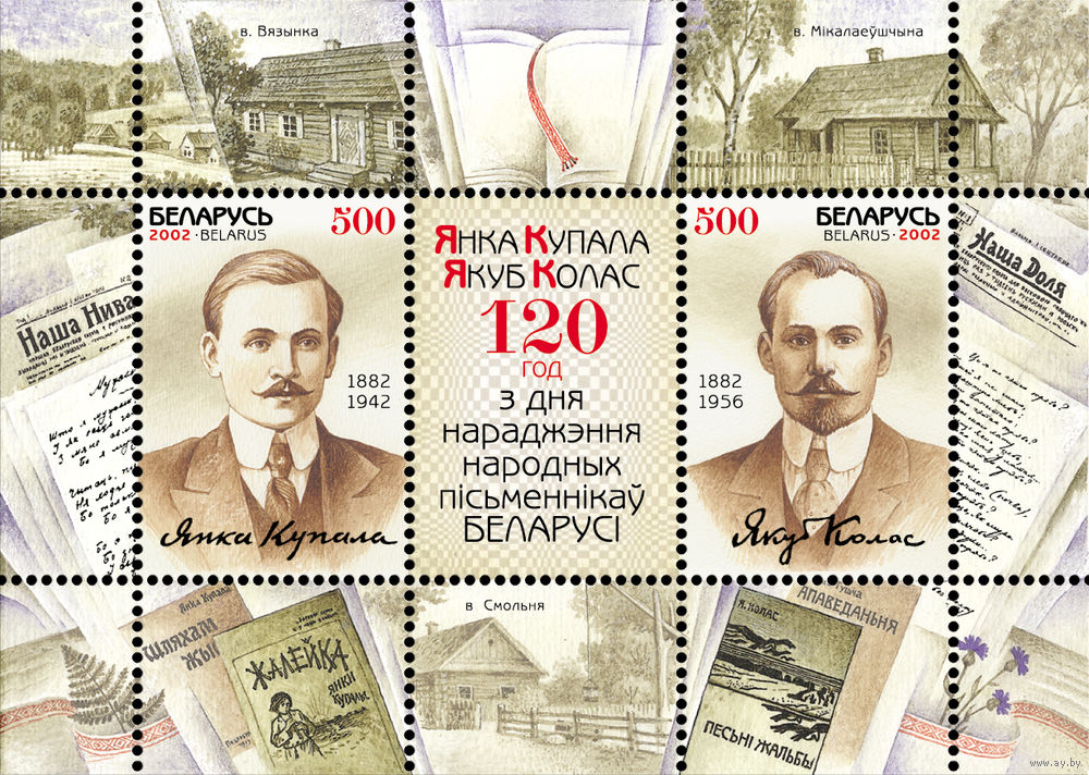 2002 БЕЛАРУСЬ блок коллекционных марок 120 лет со дня рожд. Я.Коласа и Я.Купалы MNH