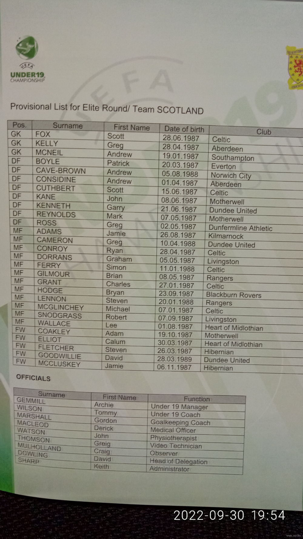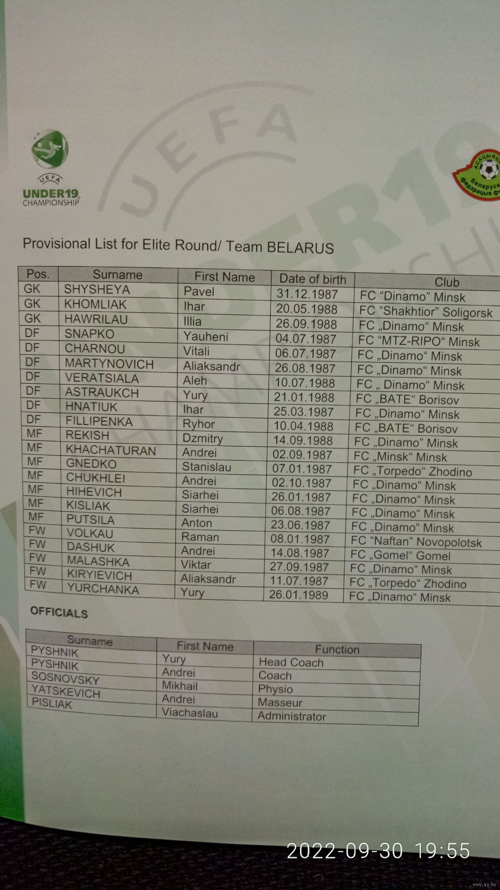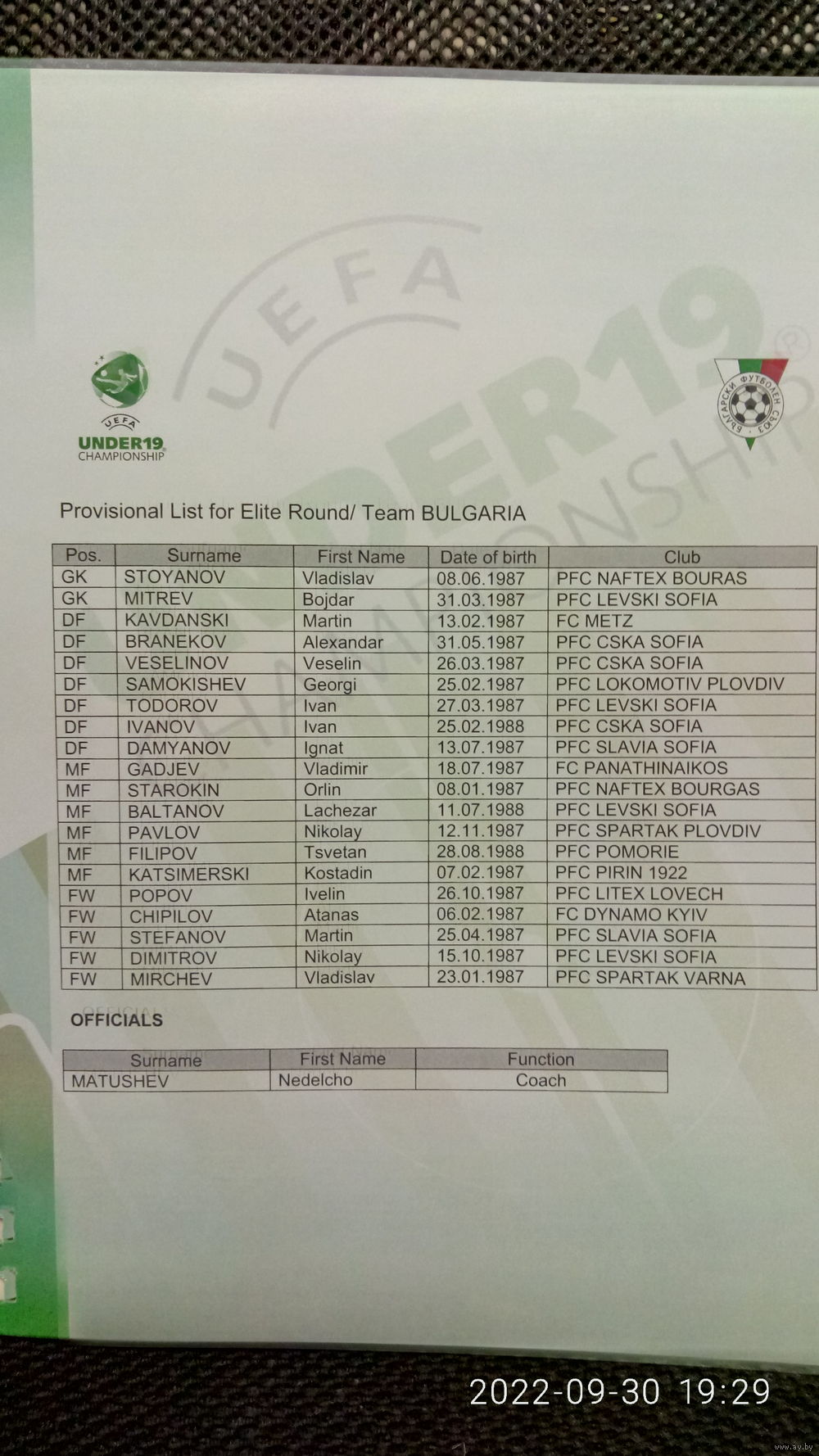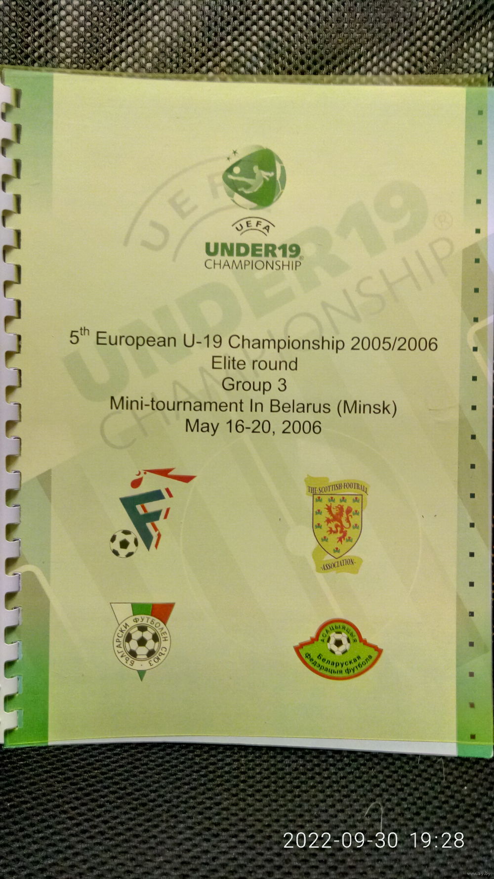 Отборочная группа элитного раунда с участием юношеских сборных U19 Беларуси, Болгарии, Франции, Шотландии. В лоте представлена официальная программа турнира.